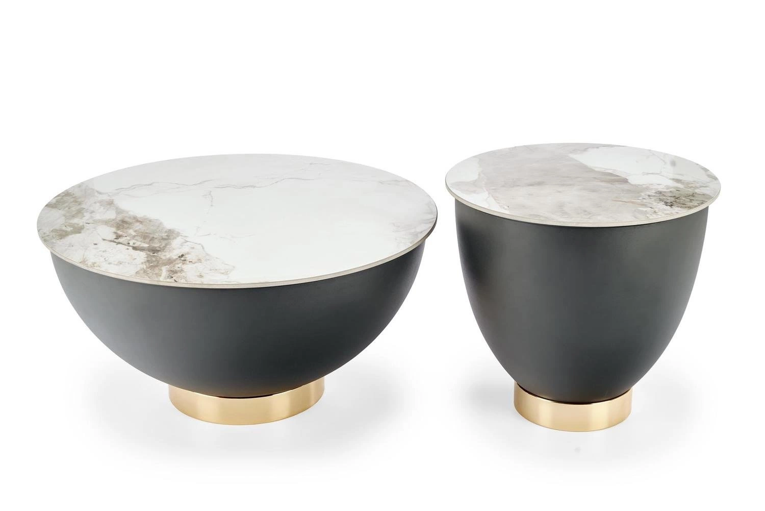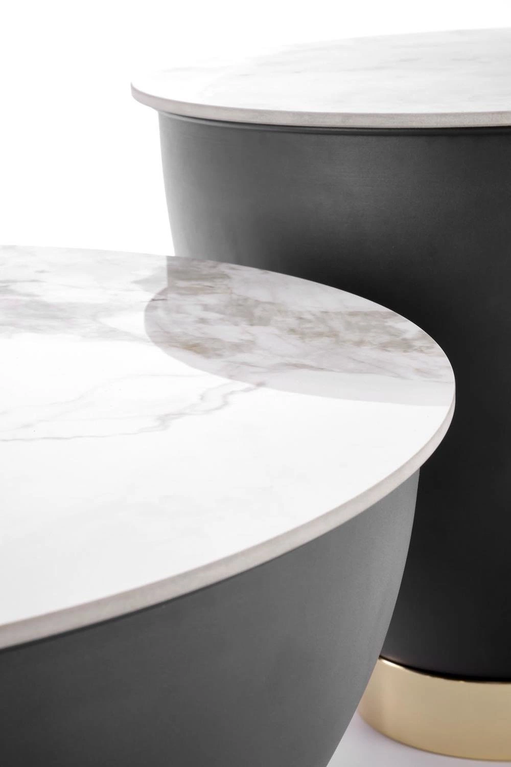 Moderní konferenční stolek Moonshine je ideální volbou pro ty, kteří si cení designu i praktičnosti. Kulatá deska o průměru 48 cm je vyrobena z odolné keramiky, která dokonale imituje strukturu bílého mramoru – díky tomu stolek působí velmi elegantně a hodí se jak do glamour interiérů, tak do minimalistických aranžmá. Ocelová podstava v matné šedé a lesklé zlaté nejen upoutá pozornost, ale také zaručuje stabilitu a dlouhou životnost i při každodenním používání.Proč si vybrat právě tento moderní konferenční stolek?