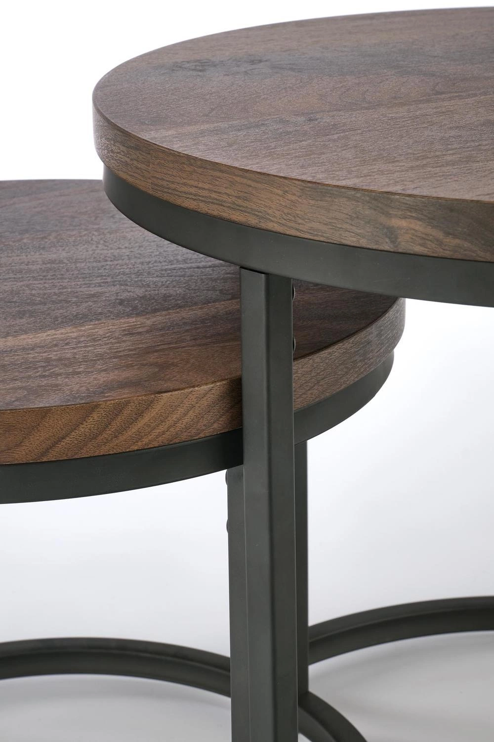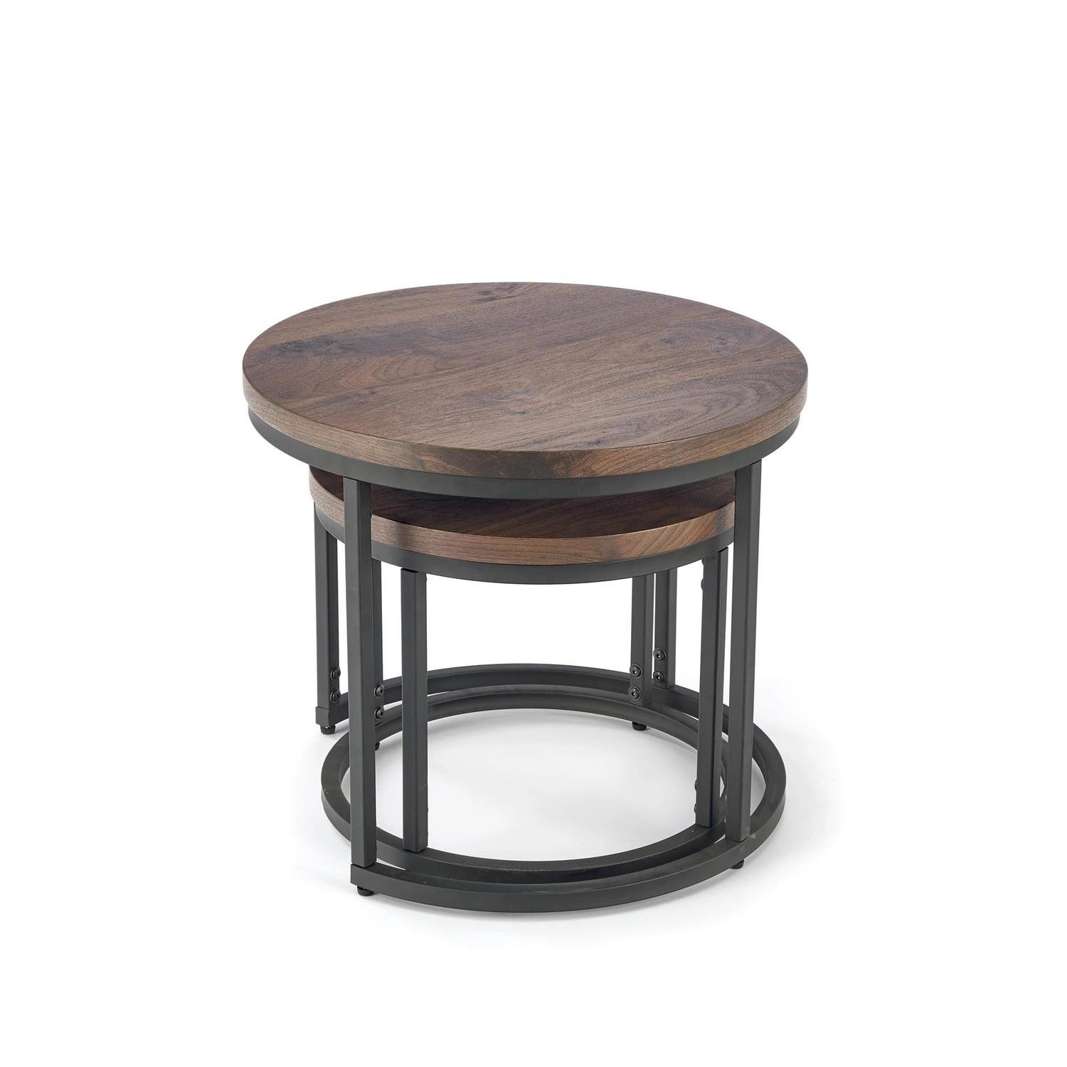 Vytvořte si doma dokonalé prostředí pro zábavu s touto sadou 2 stolů Tabarka v moderním loftovém stylu. Ocelové rámy s práškovým nástřikem a přírodní ořech dýhované desky z MDF dodají vašemu obytnému prostoru odvážný nádech.