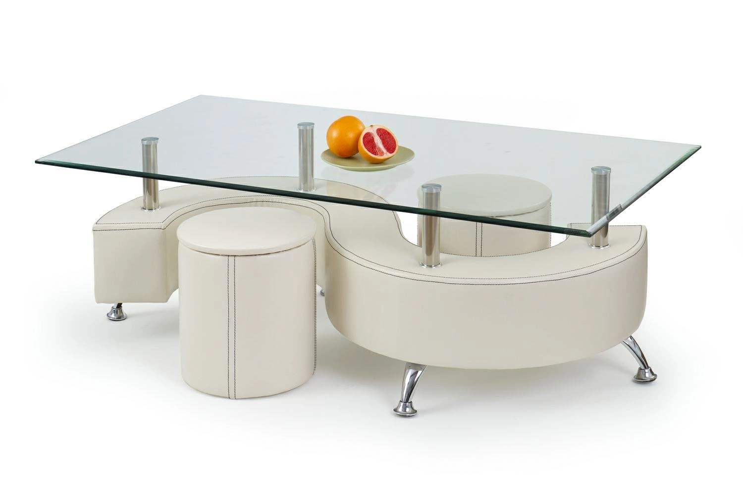 Skleněný konferenční stolek Nea se 2 bílými taburety Intesi – moderní prvek do vašeho obývacího pokoje