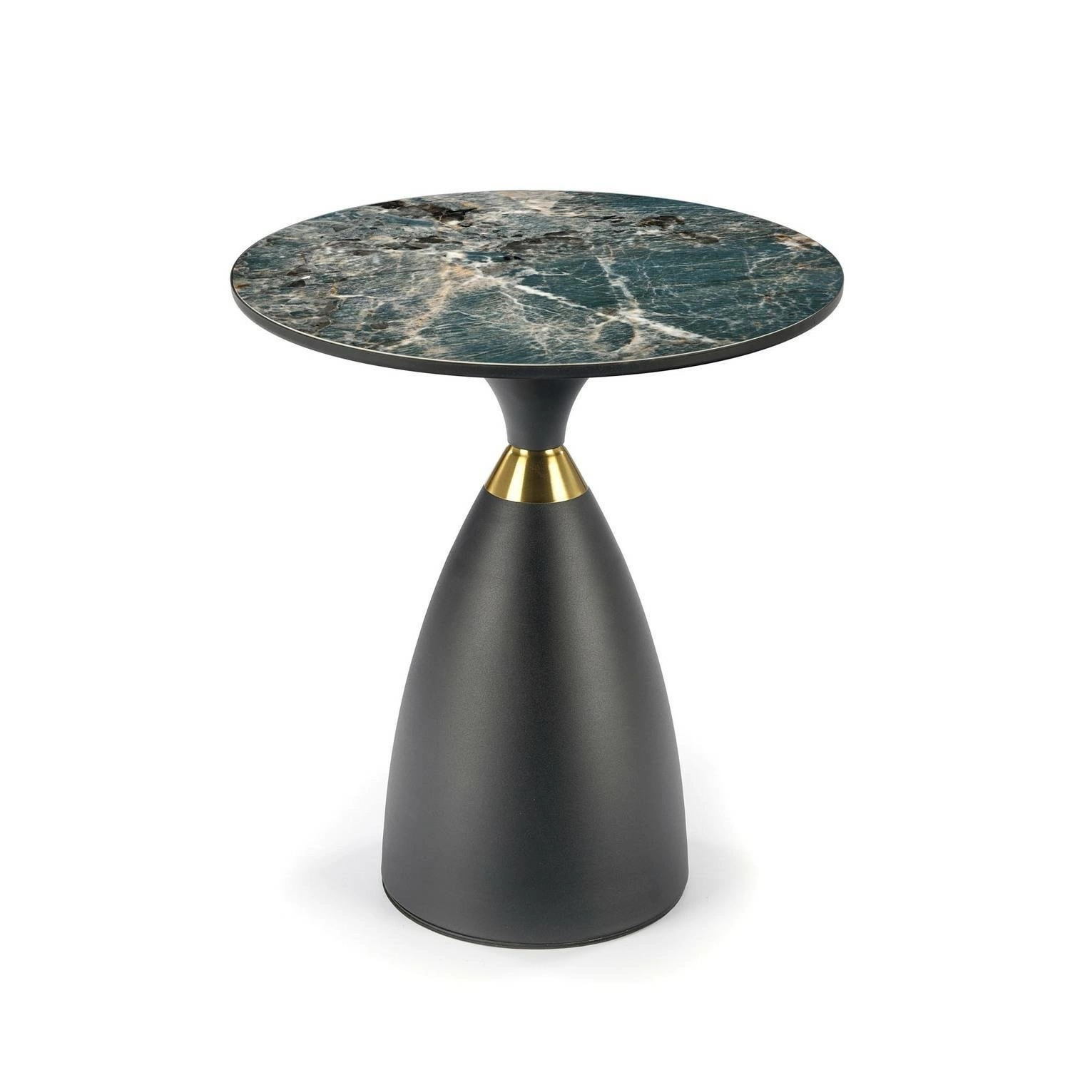 Kulatý konferenční stolek Namas glamour se zelenou mramorovou deskou od značky Intesi je skvělou volbou pro všechny, kdo si potrpí na vytříbený design a praktičnost v každodenním životě. Kulatá deska z keramiky imitující zelený mramor o průměru 50 cm a výška stolku 52 cm mu dodávají kompaktní rozměry – ideální jak do prostorného obývacího pokoje, tak do menšího obýváku. Stabilní podnož z černého polomatného kovu a zlatý detail podtrhují moderní a glamour charakter tohoto konferenčního stolku.Objevte konferenční stolek Namas – glamour styl pro váš obývací pokoj