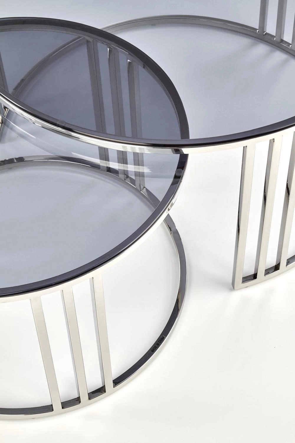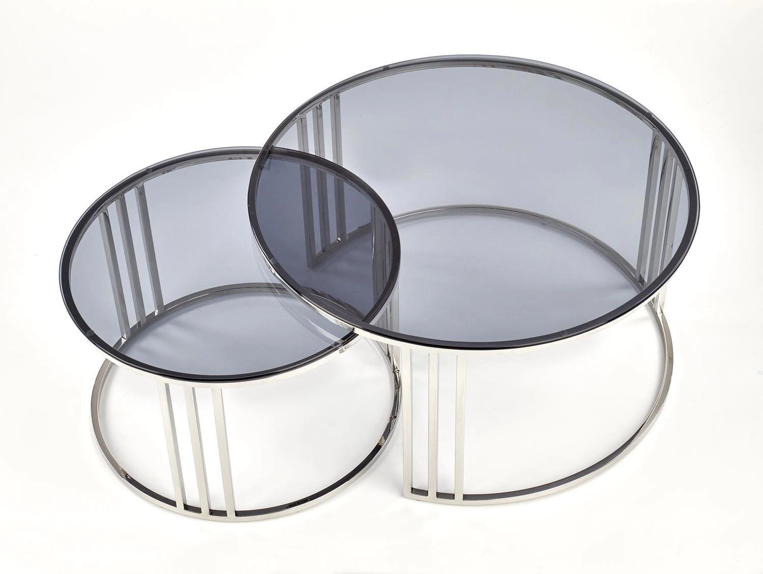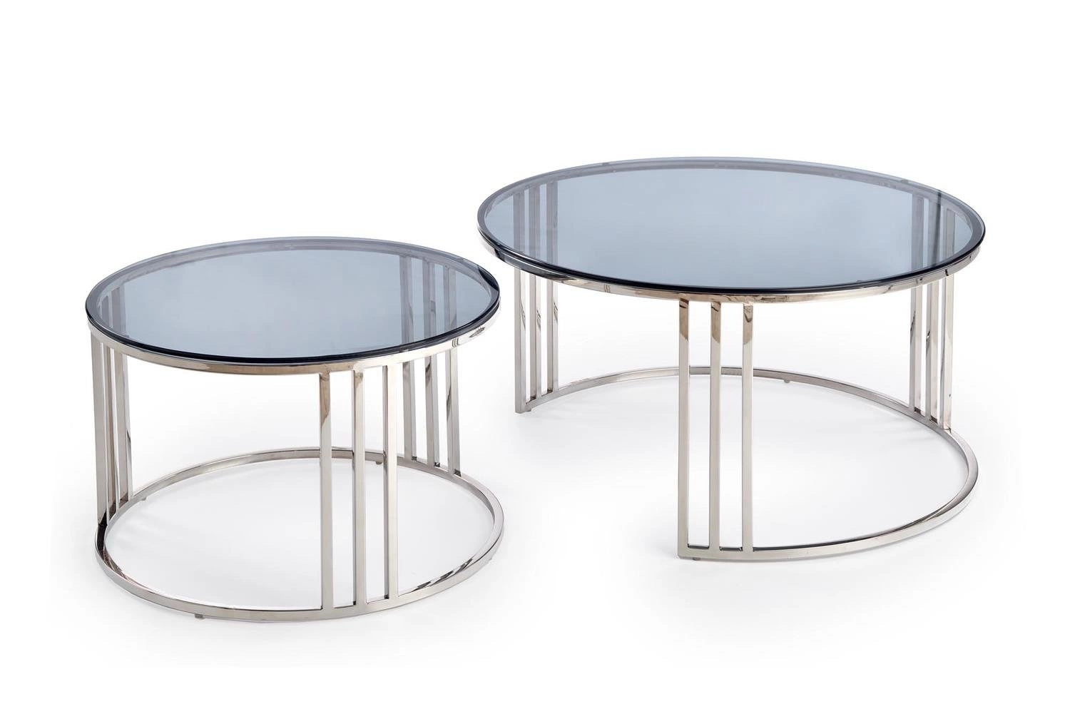 Moderní konferenční stolek Yasmine zaujme minimalistickou a zároveň sofistikovanou formou. Kulaté skleněné desky s kouřovým efektem krásně odrážejí světlo a dodávají interiéru exkluzivní glamour atmosféru. Stříbrná nerezová konstrukce zajišťuje stabilitu a dlouhou životnost a současně se snadno hodí do loftových, industriálních i moderních interiérů. Sada dvou konferenčních stolků skvěle poslouží jako originální konferenční stolek do obýváku, ale i jako elegantní odkládací stolek do ložnice nebo pracovny.