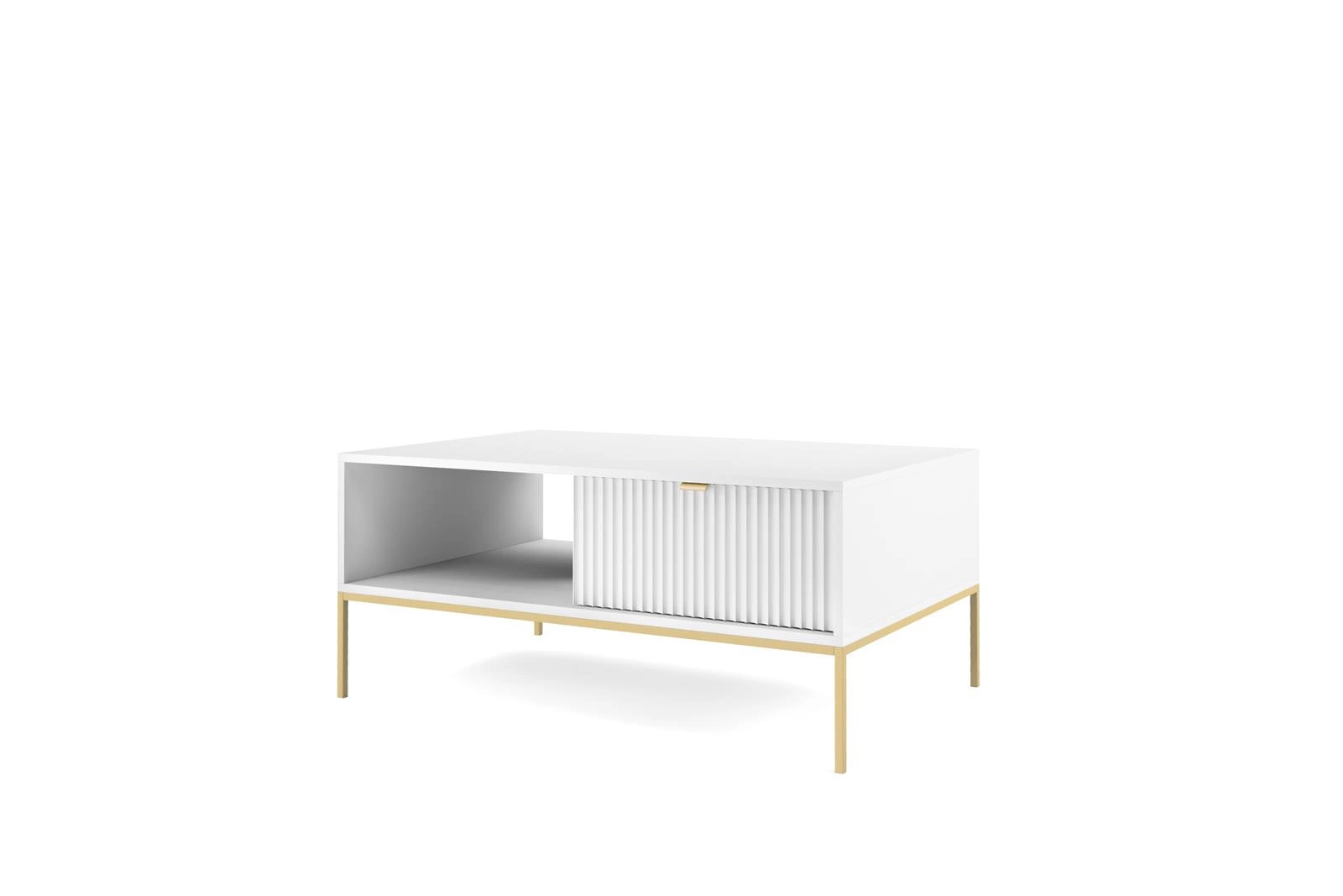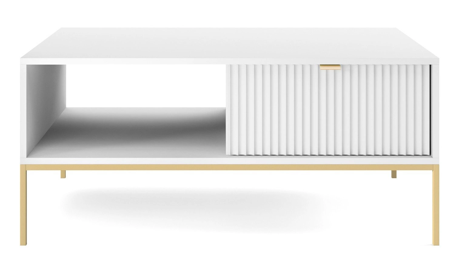 Kávový stolek Delicious bílý obdélníkový se zásuvkou a policí od značky Intesi je ideální volbou pro milovníky moderního a praktického zařízení do obývacího pokoje. Tento stylový konferenční stolek kombinuje minimalistickou bílou desku o rozměrech 104×68 cm s elegantní zlatou podnoží, čímž vytváří jedinečný akcent v každém interiéru. Výška 48 cm, praktická zásuvka s vertikálním frézováním a další odkládací police zajišťují nejen atraktivní vzhled, ale i vysokou funkčnost.Poznajte blíže kávový stolek Delicious – funkčnost a styl v jednom