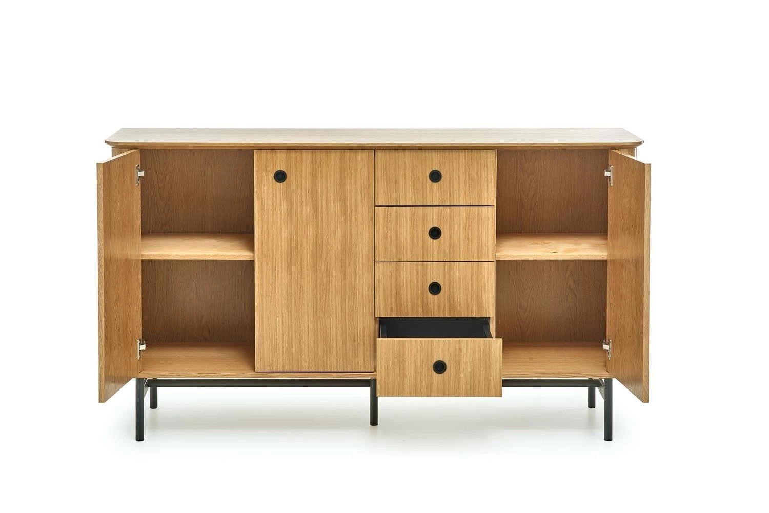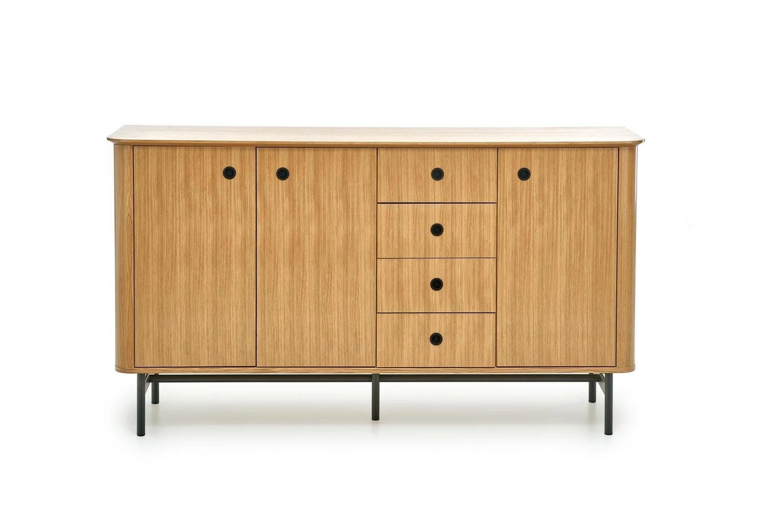 Komoda Zefir od značky Intesi je spojením skandinávské jednoduchosti a praktičnosti, která promění každý interiér. Model o šířce 167 cm a výšce 93 cm zaujme přírodním dekorem dubu, matnou černou barvou a vysokými kovovými nohami. Čtyři prostorné zásuvky a tři uzavíratelné skříňky nabízejí dostatek úložného prostoru do obývacího pokoje, ložnice nebo předsíně.