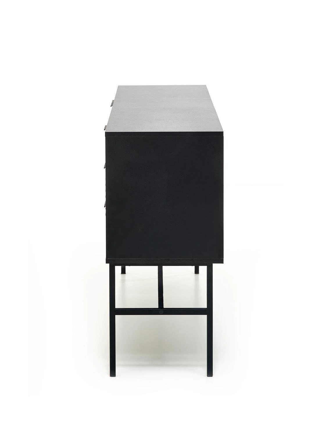 Komoda se třemi prostornými zásuvkami a dvěma uzavíratelnými skříňkami zajišťuje snadné uskladnění všeho, co potřebujete mít po ruce – od dokumentů přes textilie až po elektroniku. Kovové úchytky jsou odolné a pohodlné na používání, a vysoké nohy usnadňují udržování čistoty pod nábytkem. Použité materiály jako MDF deska a kov zajišťují stabilitu a dlouhou životnost i při intenzivním používání.