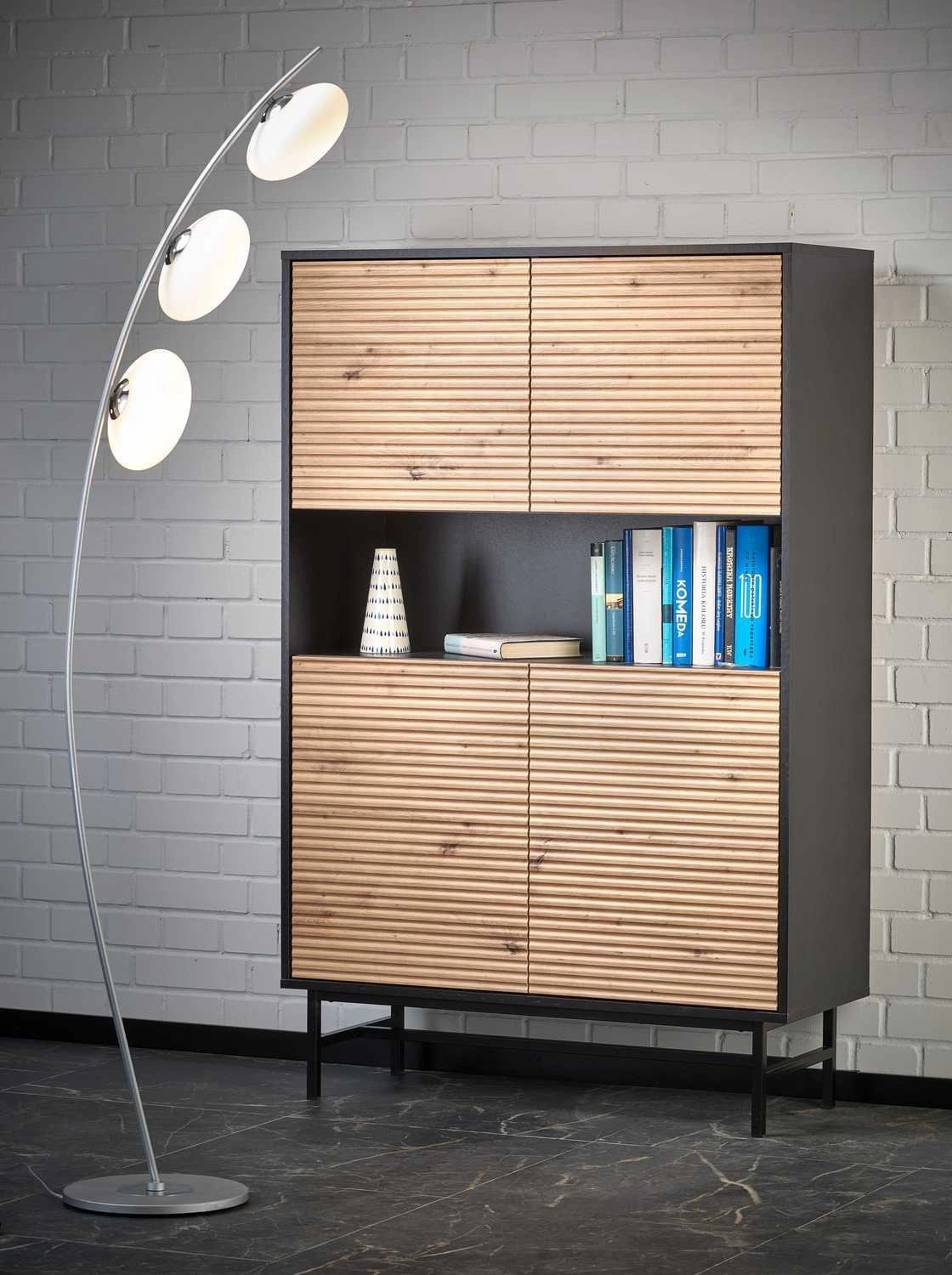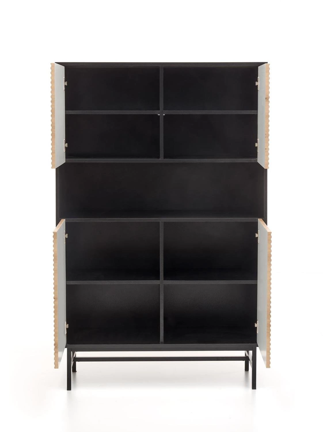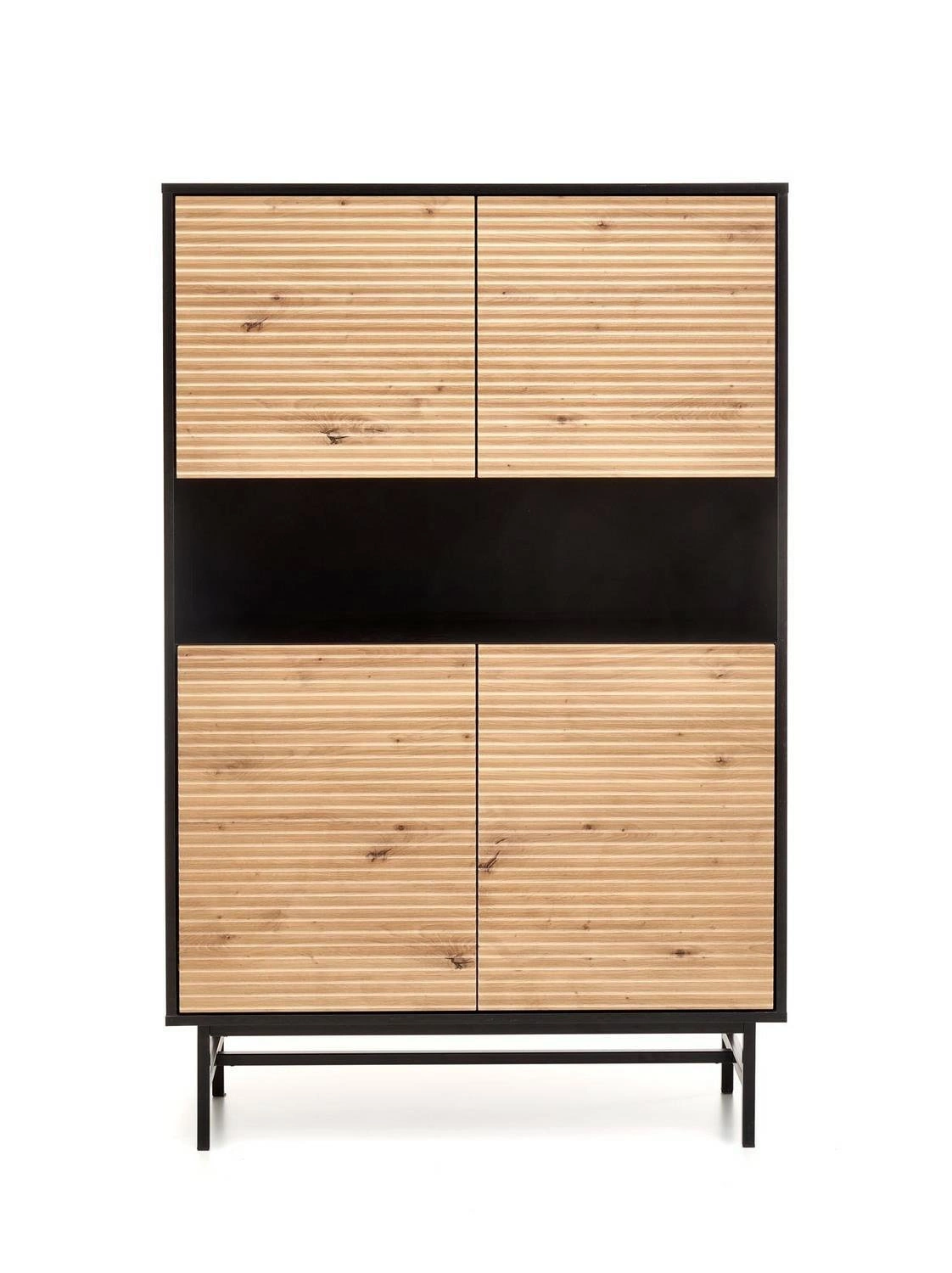 Vysoká komoda Nihala od značky Intesi je dokonalým spojením nadčasového loftového stylu a každodenní praktičnosti. Vyrobena v efektní kombinaci dekoru dub artisan a černé barvy, zaujme frézovanými čely a pevnou kovovou podstavou na čtyřech nohách. Díky výšce 156 cm a šířce 100 cm nabízí až 9 prostorných polic a 4 uzavíratelné skříňky, které pomohou snadno uspořádat prostor v obývacím pokoji, ložnici nebo předsíni.