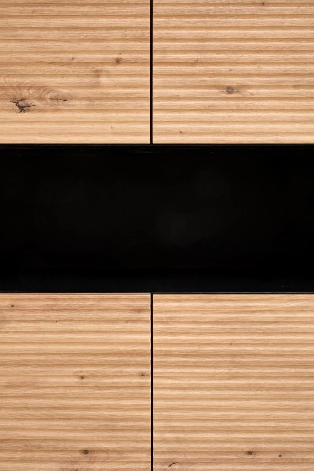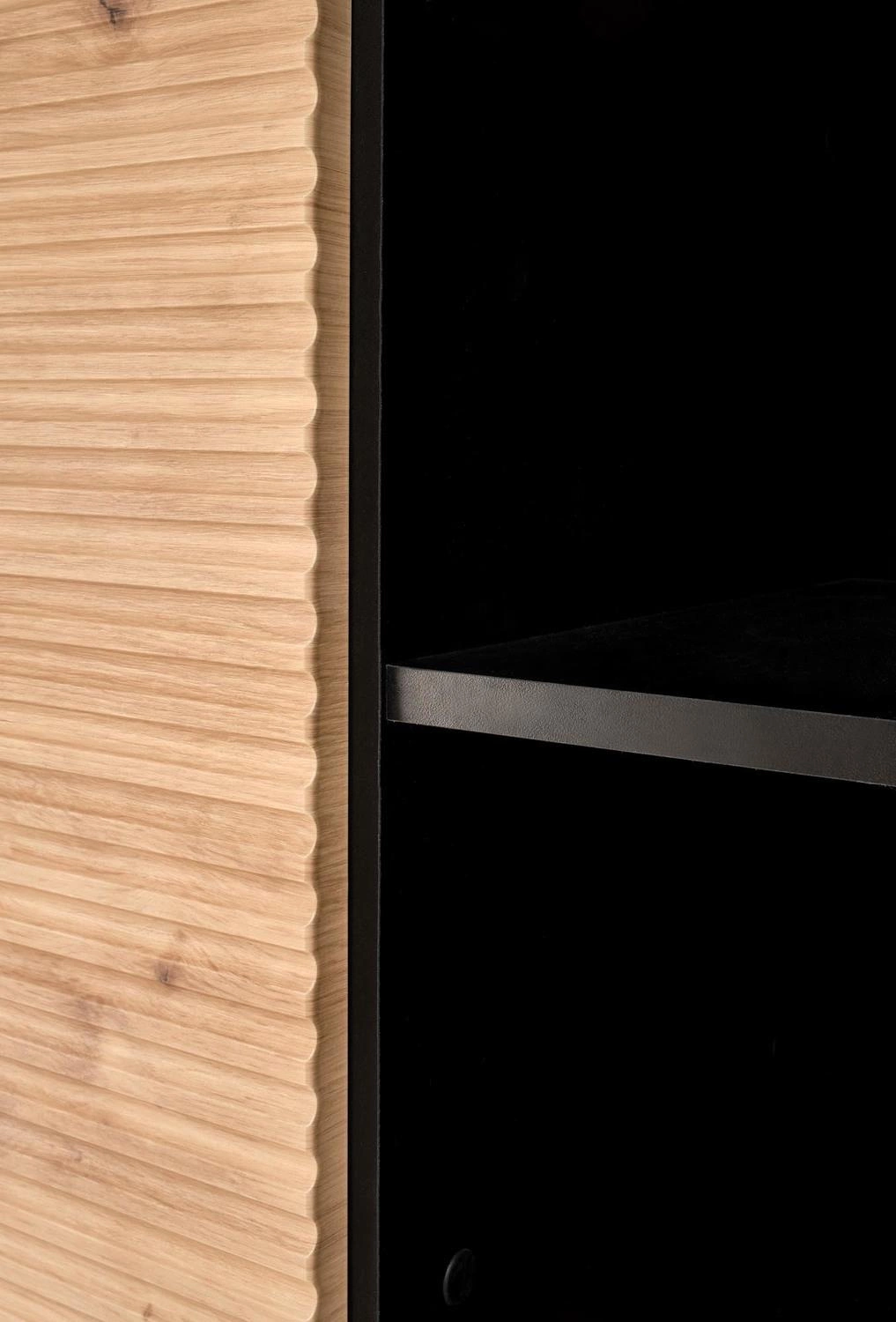 Komoda Nihala dub artisan černá je ideální volbou pro milovníky moderních a industriálních interiérů. Horizontálně frézovaná dvířka jí dodávají originalitu a hloubku, čímž vytváří stylový prvek v každé místnosti. Teplý odstín dubu artisan příjemně zjemňuje kontrast černého polomatu, zatímco vysoké kovové nohy přidávají vzdušnost a podtrhují loftový charakter nábytku. Tento design skvěle zapadne jak do minimalistických, tak i do více eklektických aranžmá.