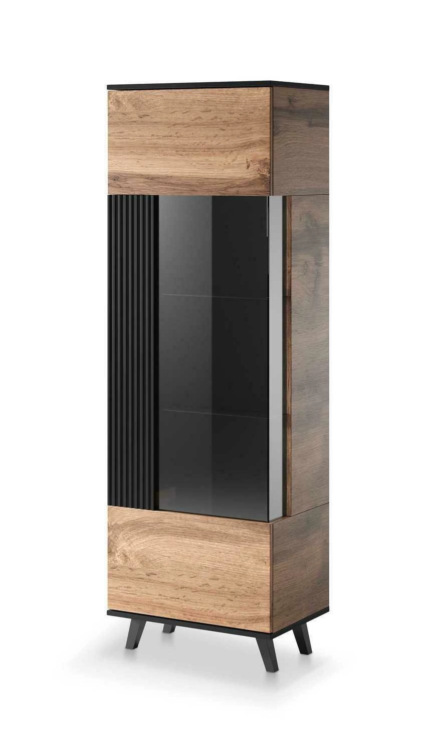 Vitrína Adre byla navržena pro všechny, kdo mají rádi moderní interiéry v loftovém stylu. Spojení přírodního odstínu dubu s hlubokou černou základnou vytváří výrazný kontrast, který zvýrazní charakter vašeho obýváku. Prosklené dveře dodávají vitríně lehkost, zároveň však chrání obsah před prachem. Je to skvělá volba do moderních aranžmá, kde se snoubí design s každodenním komfortem.