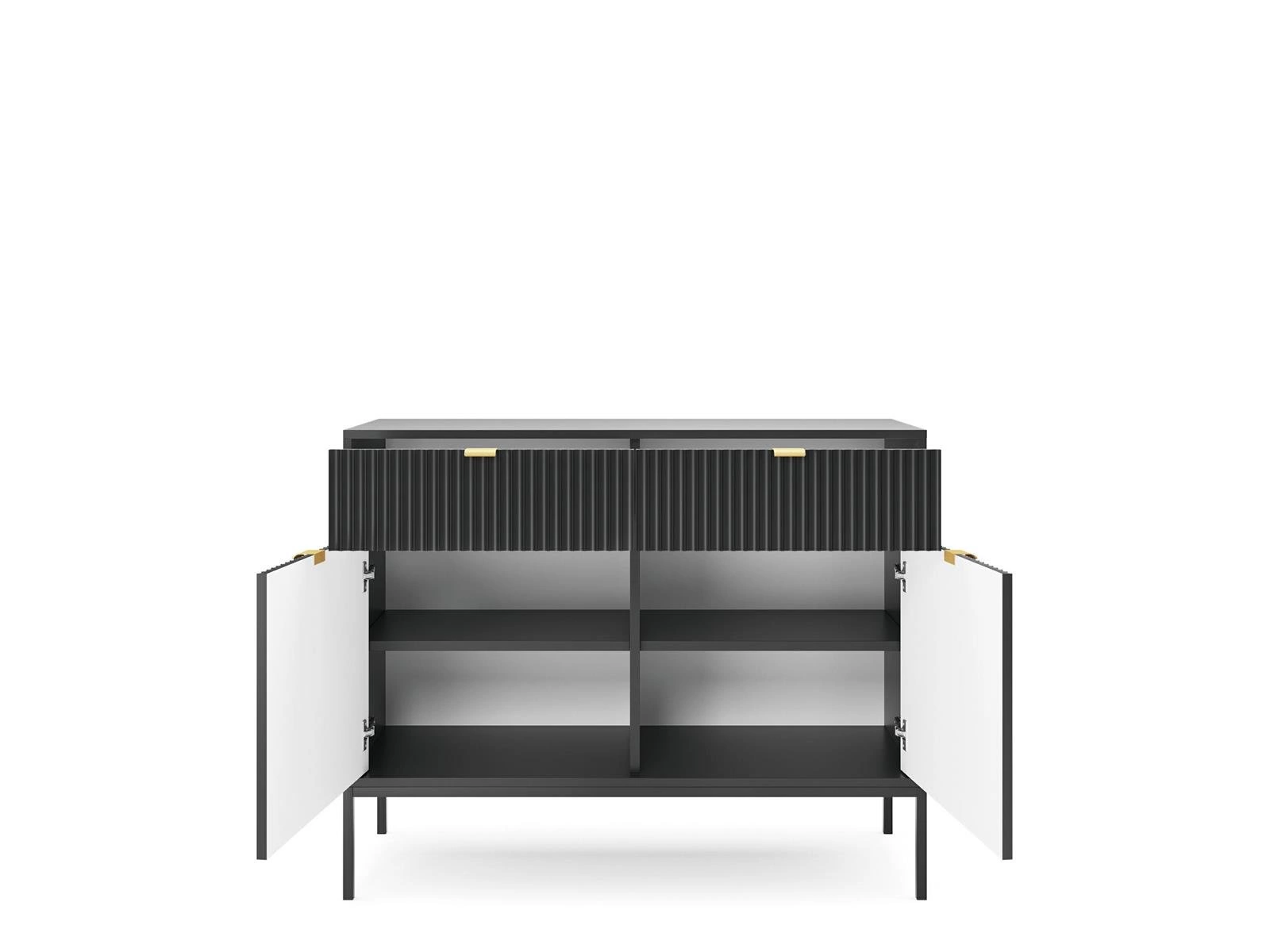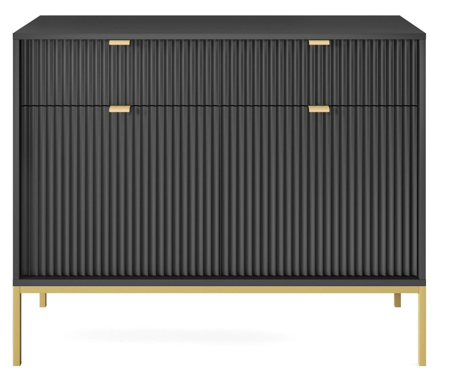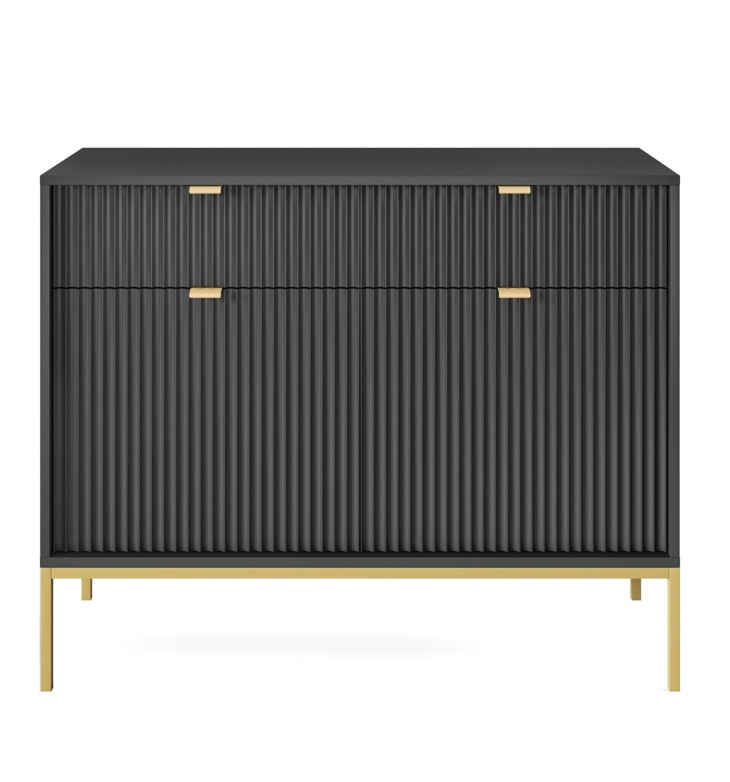 Komoda Delicious ryhovaná černá se zásuvkami Intesi není jen stylovým doplňkem, ale také pohodlným úložným centrem. Díky dvěma zásuvkám a čtyřem policím snadno uspořádáte dokumenty, textilie, elektroniku nebo domácí doplňky. Vysoké nohy usnadňují údržbu podlahy – robotický vysavač pod ně bez problémů zajede. Kovové úchyty ve zlatém odstínu podtrhují exkluzivní charakter nábytku a zároveň zajišťují pohodlné každodenní používání.