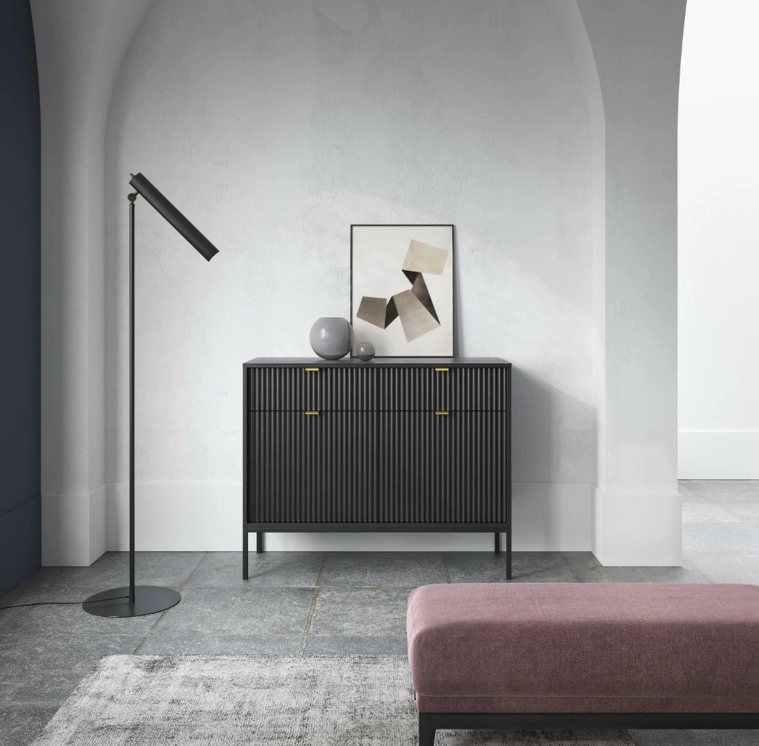 - Moderní ryhovaná komoda – vyniká designovými čely a lesklou černou, ideální do obývacího pokoje, ložnice, předsíně nebo kanceláře.