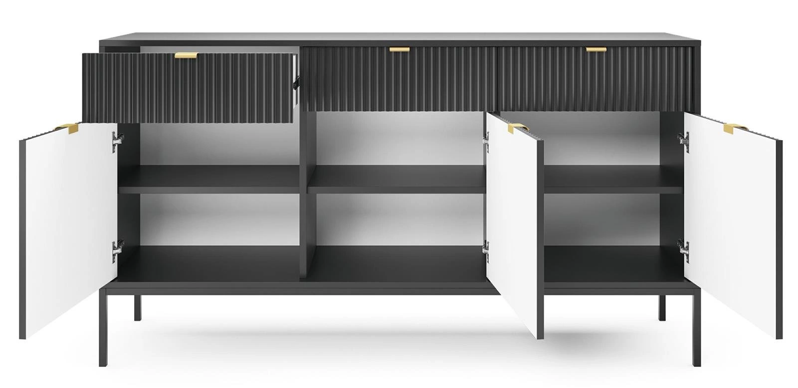 Přední plochy této komody do obývacího pokoje upoutají pozornost jemným svislým frézováním, které krásně odráží světlo a dodává interiéru hloubku. Lesklá černá v kombinaci se zlatými detaily přináší do prostoru nádech luxusu a podtrhuje atmosféru glamour nebo moderních, elegantních interiérů. Díky šířce 154 cm je tento kus nábytku ideální také jako komoda pod televizi v obýváku.