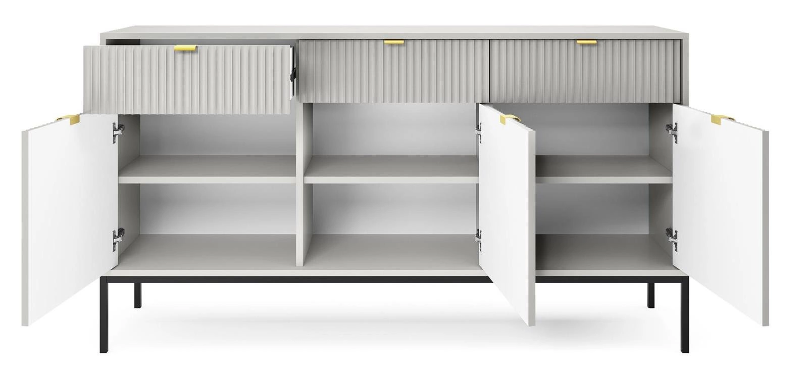 Oszałamiająca komoda z ryflowanymi frontami i stylowymi złotymi uchwytami wniesie wyrafinowanie i urok do każdej przestrzeni. Jej trzy szuflady i trzy szafki oferują dużą pojemność do przechowywania wszystkich rzeczy - od odzieży i biżuterii po sztućce, pamiątki i elektronikę. Co więcej, metalowe nóżki zapewniają długotrwałą stabilność, a także dodatkową wysokość, dzięki czemu można bez wysiłku sięgać w dół lub sprzątać pod nim bez trudności.