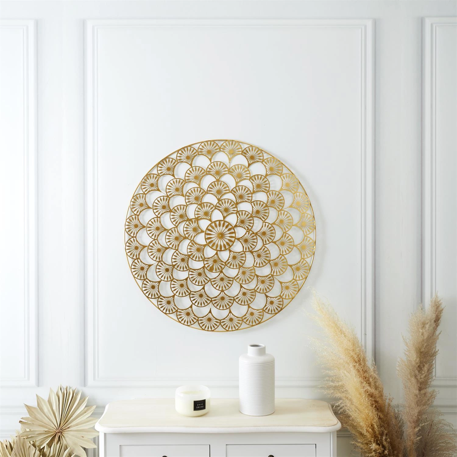 Intesi Mandala je zlatá nástěnná dekorace, která zaujme kulatým tvarem o průměru 70 cm a precizním, vzdušným vzorem inspirovaným motivem mandaly. Vyrobena z kovu s elegantním leskem, skvěle doplňuje interiéry ve stylu glamour a dodává jim luxusní atmosféru. Dekorace je připravena k zavěšení a představuje výjimečnou ozdobu na stěnu do obývacího pokoje, ložnice, předsíně nebo reprezentativní kanceláře.