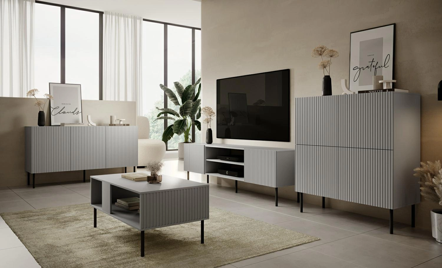 RTV skříňka Harbin byla navržena pro milovníky současných trendů v interiéru. Moderní vzhled podtrhují vertikálně frézovaná čela, která dodávají nábytku hloubku a jedinečný charakter. Šedé, polomatné tělo v odstínu popela skvěle ladí s černou podnoží, vytváří efektní kontrast a harmonicky zapadá do prostoru moderních obývacích pokojů. Tento styl televizní skříňky umožňuje snadné začlenění do minimalistických a elegantních interiérů.