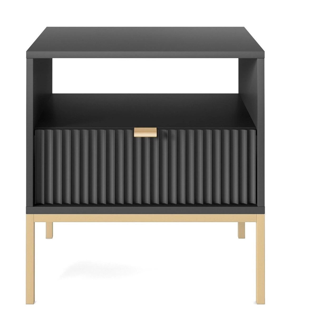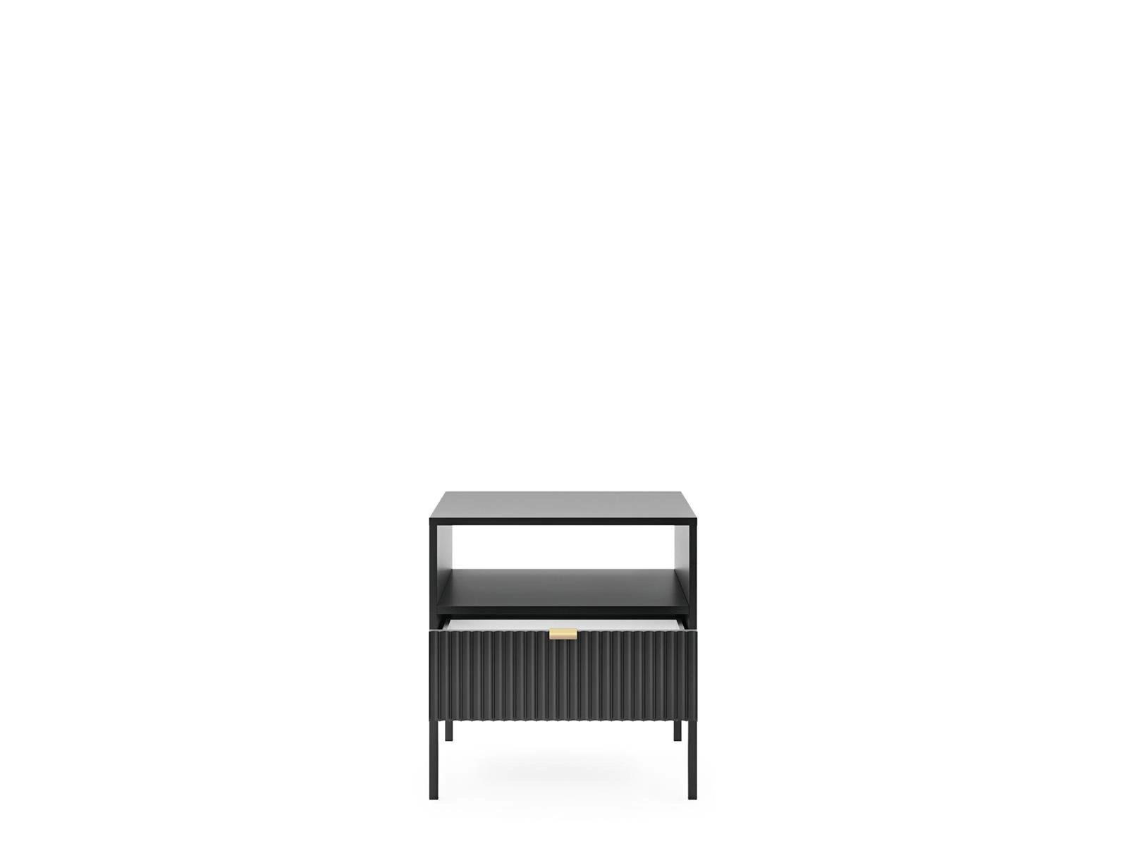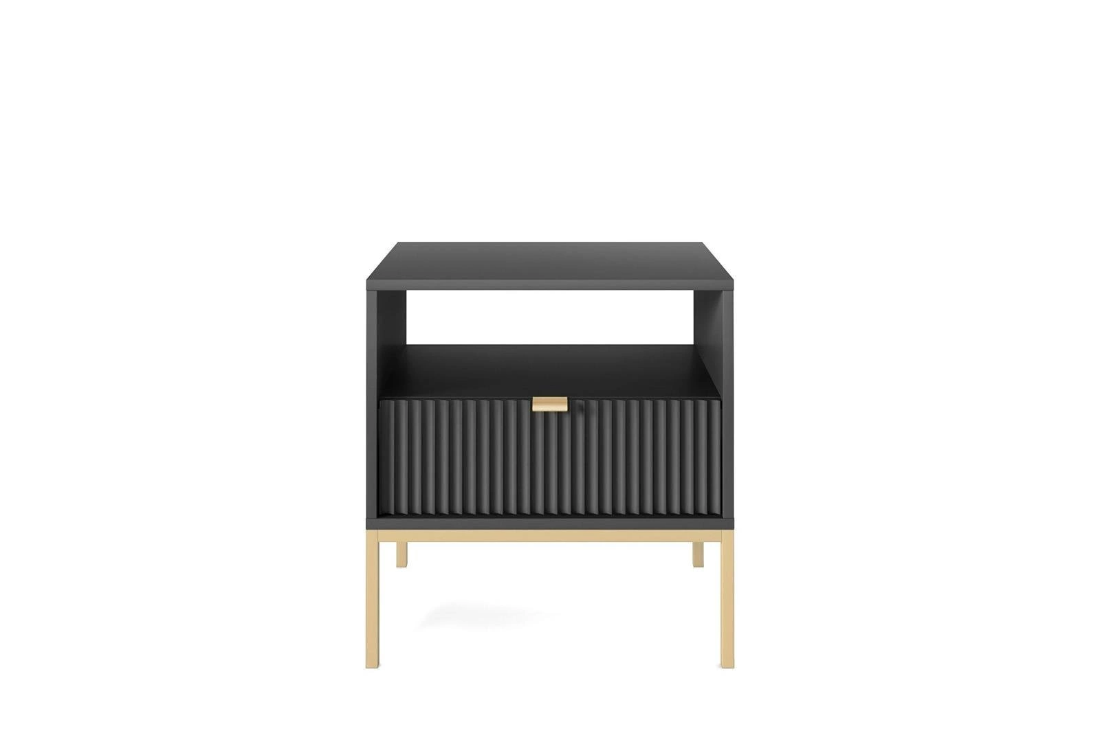 Noční stolek Delicious Intesi 54 cm je výjimečnou kombinací elegance a praktičnosti, navrženou pro nejnáročnější interiéry. Rýhované čelo v hluboké černé barvě, umístěné na štíhlých kovových nohách ve zlatém odstínu, podtrhuje luxusní charakter tohoto nábytku. Díky šířce 54 cm a kompaktní hloubce 39 cm je stolek ideální volbou do ložnice, kde nabízí praktický úložný prostor pro všechny nezbytnosti.