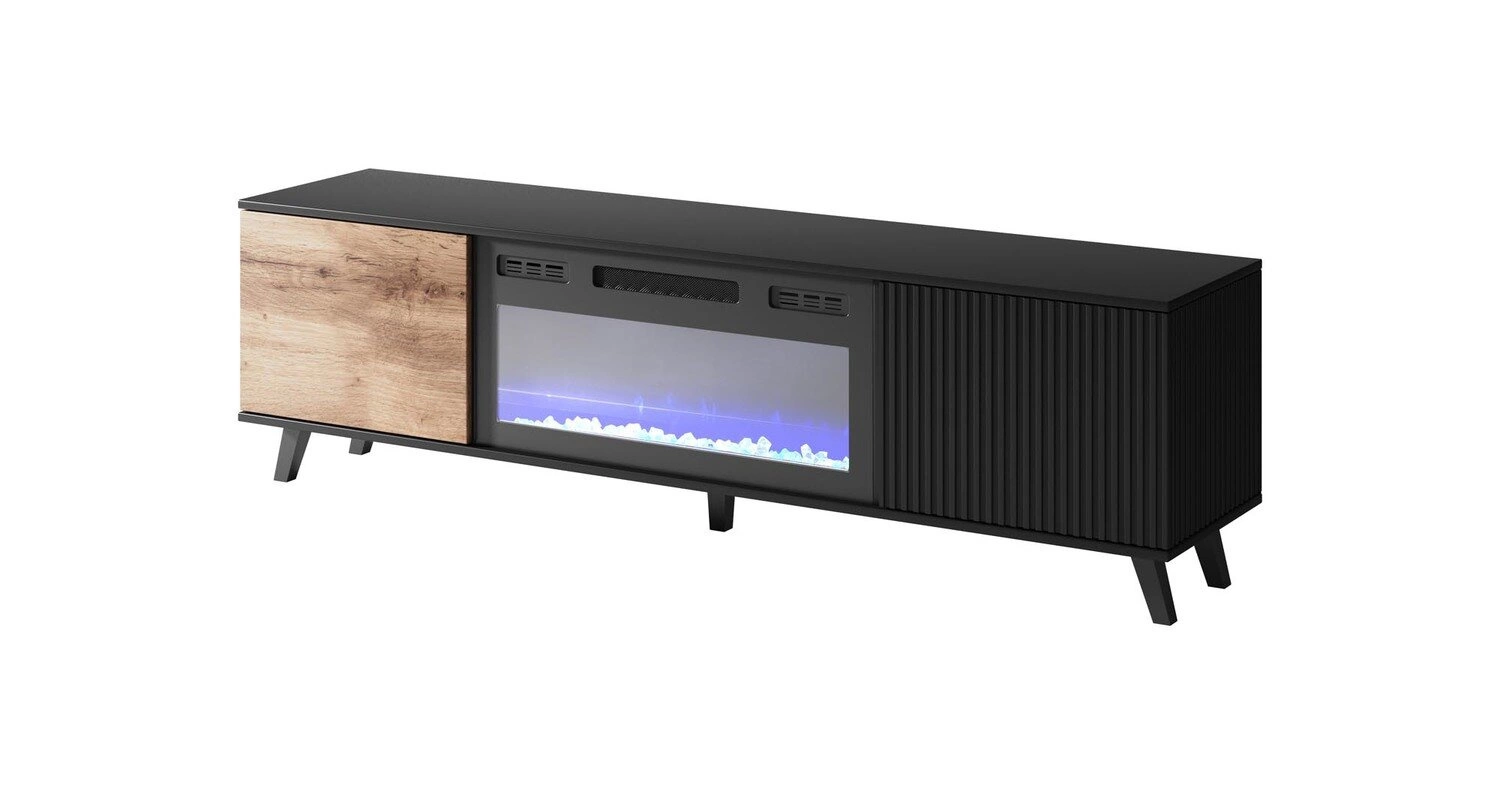Uzyskaj idealną konsolę multimedialną do swojej przestrzeni życiowej dzięki tej stylowej szafce RTV od Intesi. 180-centymetrowa szafka w kolorze dąb wotan i czarnym posiada wbudowany kominek, fornirowaną konstrukcję MDF i okleinowaną płytę meblową.