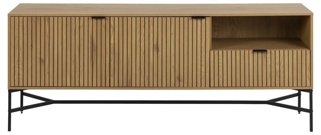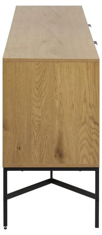 Komoda Jaipur v industriálním stylu od značky Actona je kombinací přírodního dekoru dub artisan s výraznými, vertikálně frézovanými čely a černou kovovou podnoží na čtyřech nohách. Šířka 180 cm a výška 70 cm dělají z této komody ideální volbu do obývacího pokoje – perfektně spojuje úložnou funkci s dekorativním akcentem. Díky prostorné zásuvce a dvěma skříňkám s policemi snadno uložíte jak drobnosti, tak větší předměty každodenní potřeby.