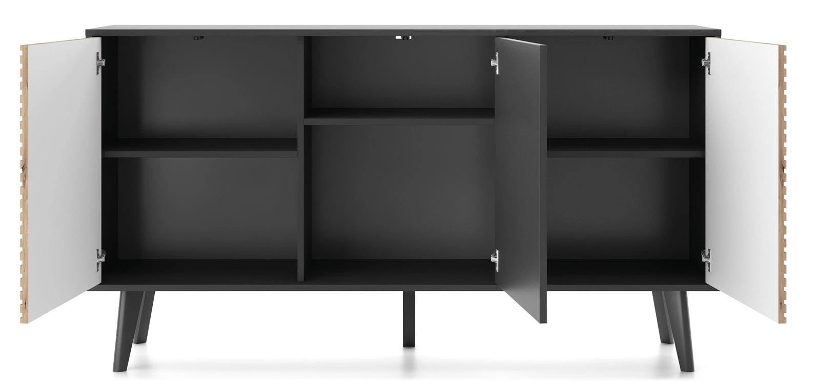 Komoda do obývacího pokoje Tanga 154 cm byla navržena pro maximální pohodlí při používání. Tři prostorné police pojmou dokumenty, textilie nebo sbírku médií, a systém push to open umožňuje otevírat dvířka jemným stisknutím – bez nutnosti použití úchytů. Vysoké nohy usnadňují úklid pod nábytkem, což ocení zejména majitelé robotických vysavačů a alergici.