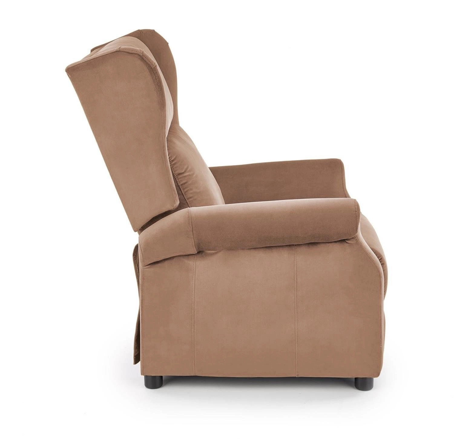 Rozkládací křeslo do obývacího pokoje Nagu od značky Intesi je ideální volbou pro ty, kteří si potrpí na glamour eleganci a pohodlí při odpočinku. Čalounění z měkkého sametového materiálu v hlubokém béžovém odstínu nabízí příjemný pocit na dotek a zároveň působivý vzhled. Tento model vyniká možností rozložení, díky čemuž jej snadno přizpůsobíte relaxaci po náročném dni. Stabilitu zajišťuje černý čtyřnohý podstavec z odolného plastu, zatímco široké sedadlo (75 cm) a vysoké opěradlo (107 cm) slibují pohodlí i při dlouhém sezení.