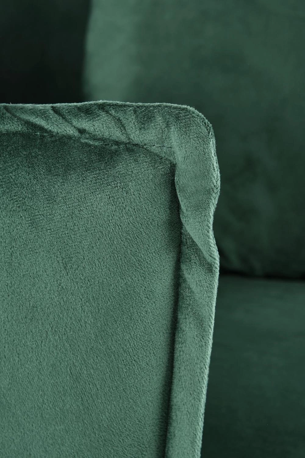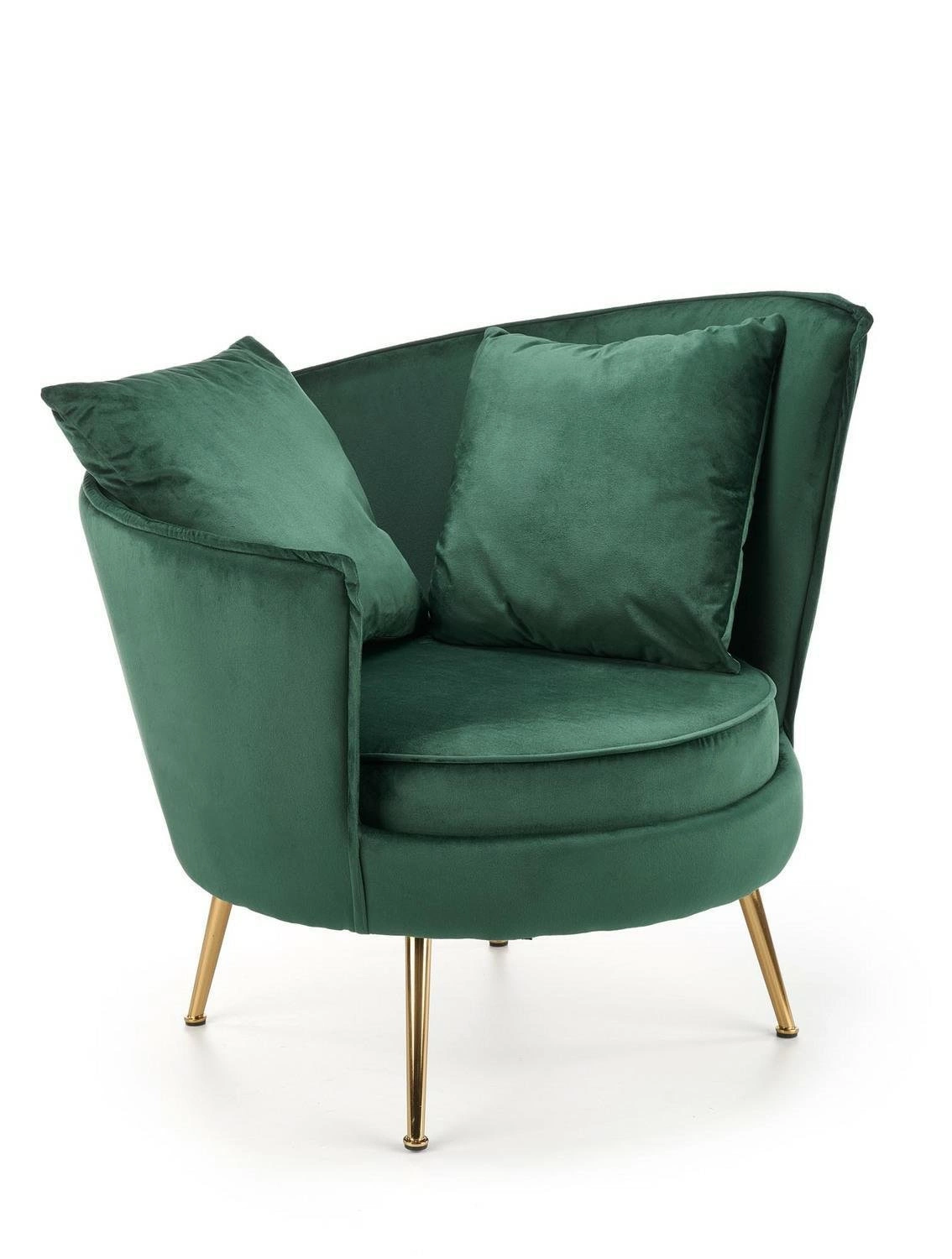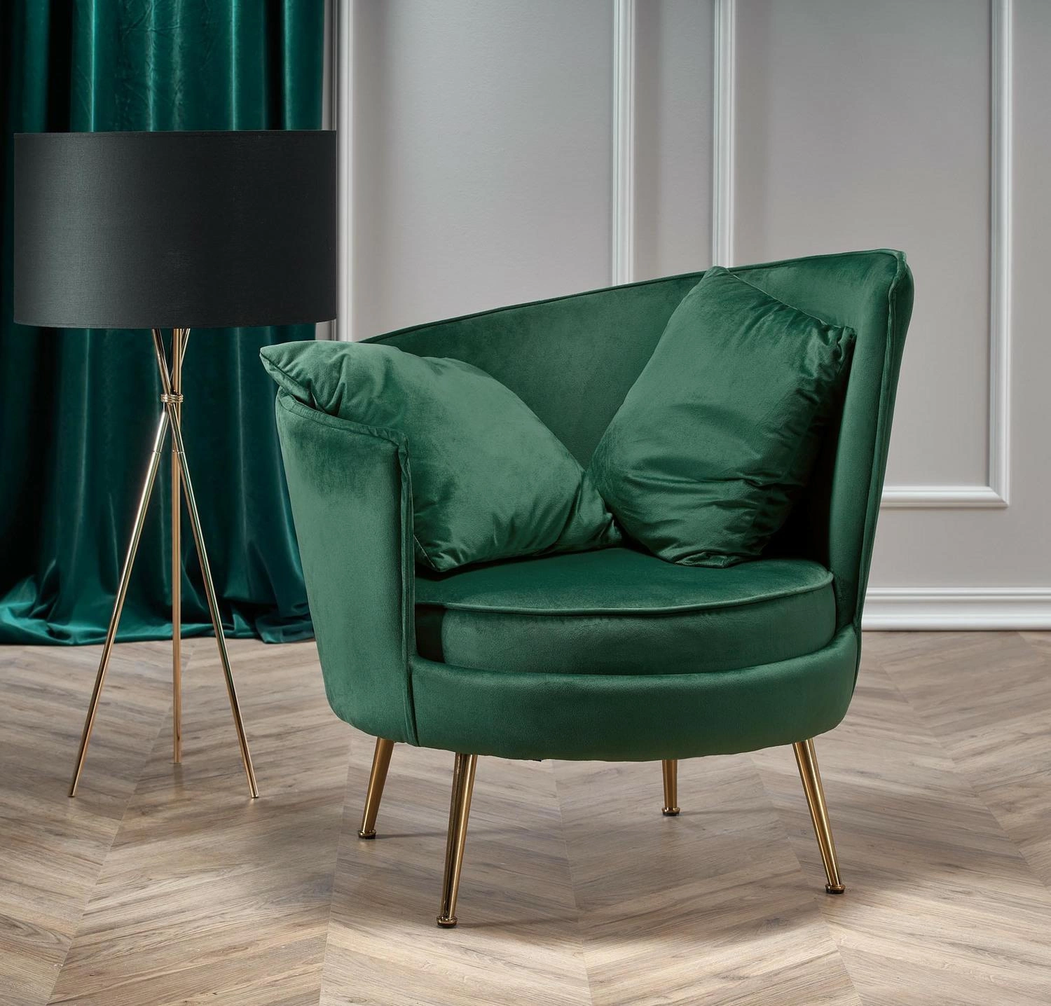 Modin je křeslo do obývacího pokoje, které se okamžitě stává dominantou interiéru. Kombinace sametové látky a lesklé zlaté základny dokonale zapadá do aranžmá ve stylu glamour. Tmavě zelená barva dodává prostoru hloubku a eleganci, jemně kontrastuje se světlými prvky vybavení. Křeslo se skvěle hodí také do ložnice nebo stylové čekárny, kde navodí luxusní a sofistikovanou atmosféru.