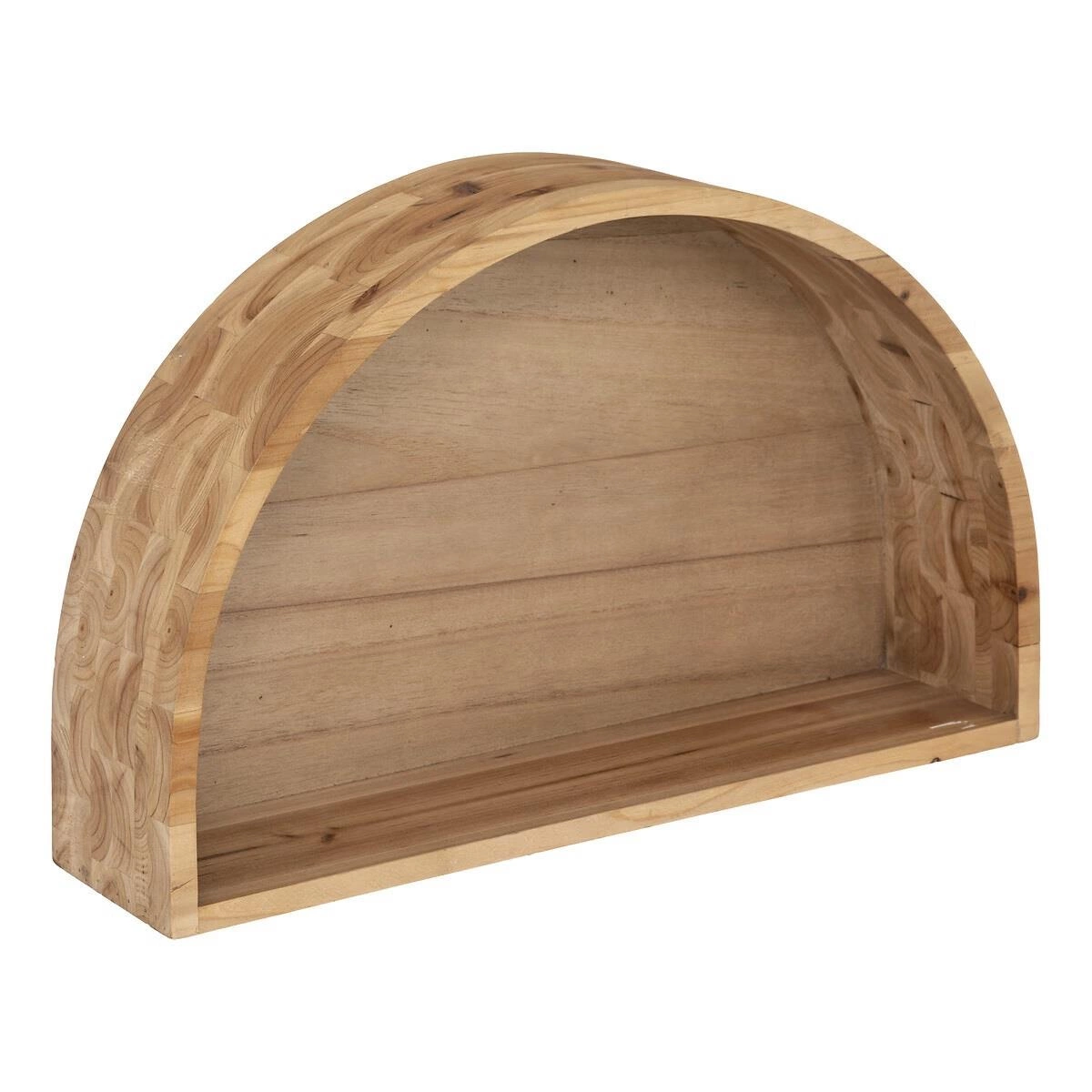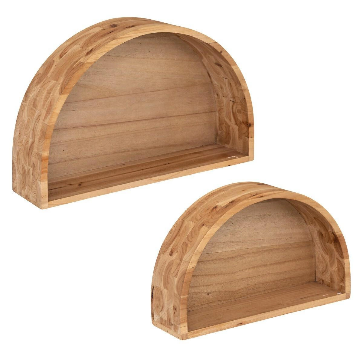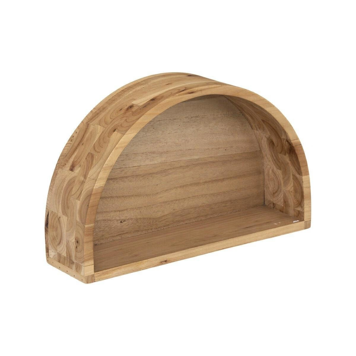 Police Maude zaujmou půlkruhovým tvarem, který vnáší do prostoru originální prvek. Přirozená barva dřeva podtrhuje syrovost a autentičnost, tolik žádané v moderních loftových interiérech. Sada dvou polic umožňuje kreativní uspořádání na stěně – můžete je zavěsit vedle sebe a vytvořit působivou kompozici, nebo rozdělit do různých místností, abyste zachovali jednotný styl v celém bytě.