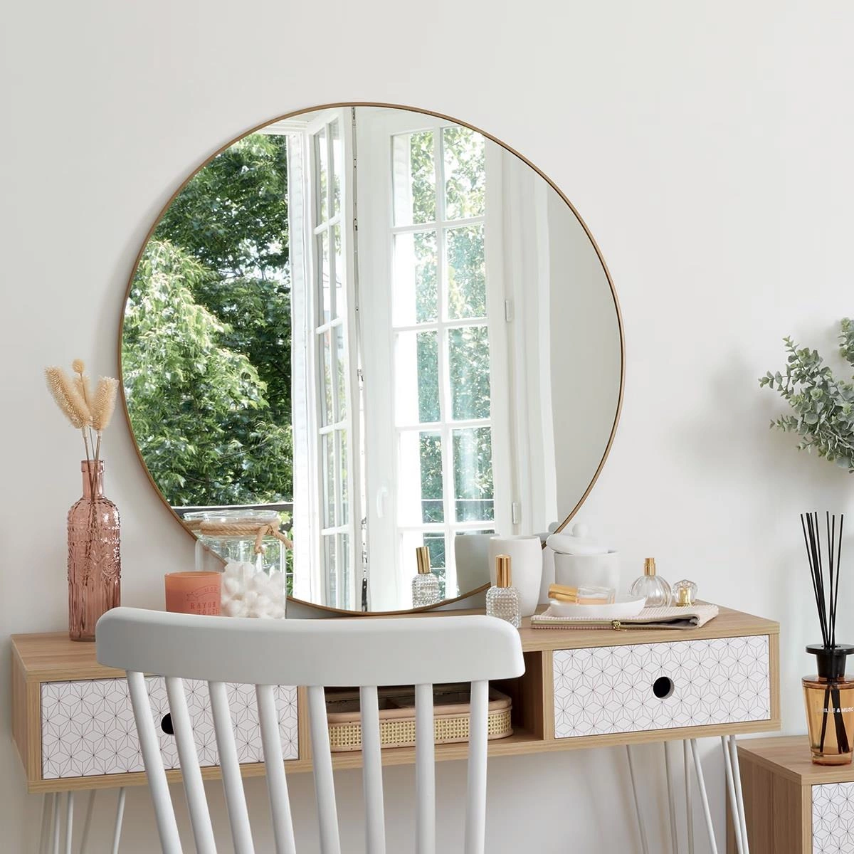 Kulaté zrcadlo Alice 76 cm od značky Atmosphera je ideální volbou pro ty, kdo oceňují moderní styl a nadčasovou eleganci. Tento model zaujme velkou, kulatou plochou skla zasazenou do zlatého kovového rámu s polomatnou povrchovou úpravou, která jemně podtrhuje charakter interiéru. Díky průměru 76 cm je zrcadlo skvělou volbou do předsíně nebo obývacího pokoje, kde opticky rozšiřuje prostor a dodává místnosti světlo.