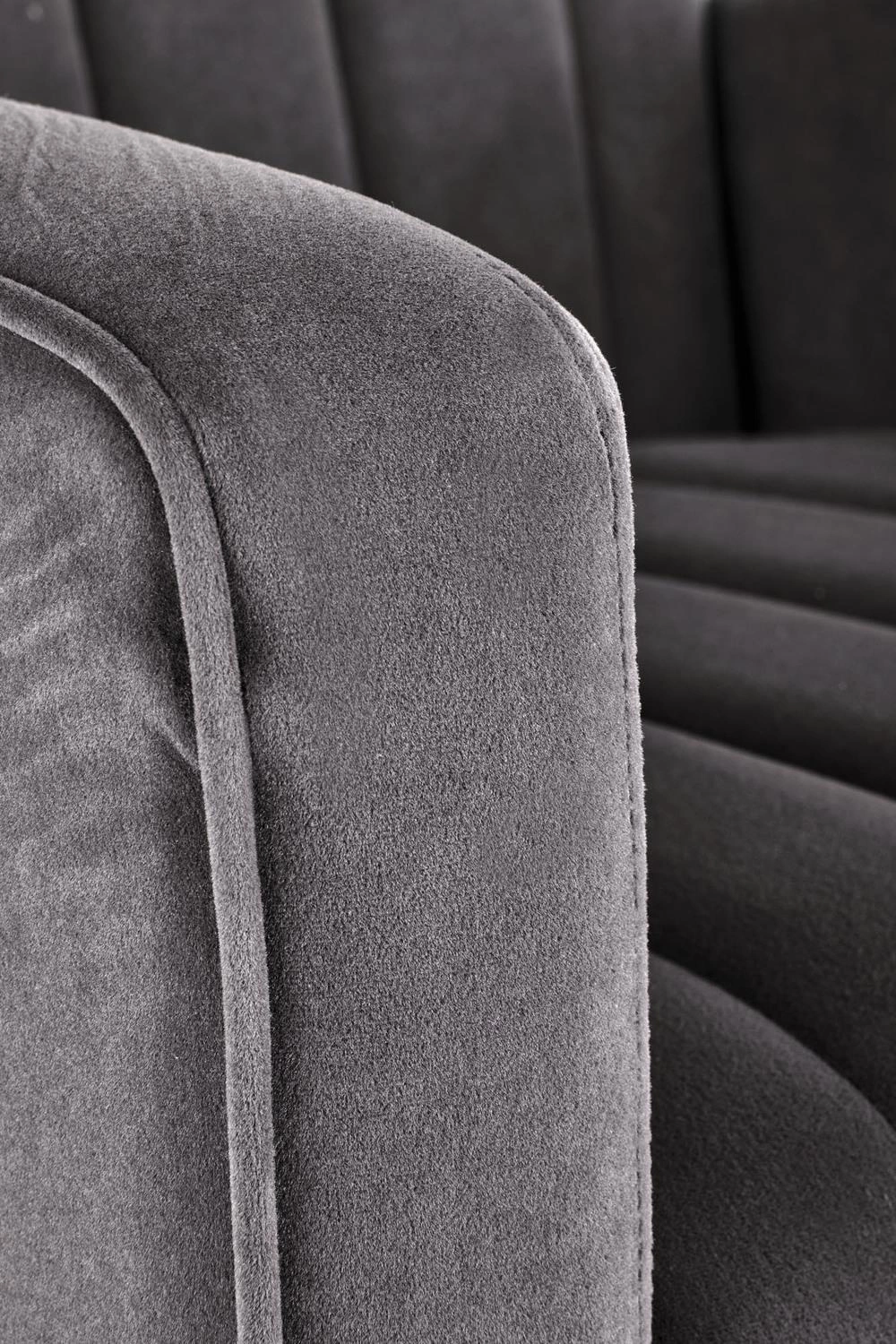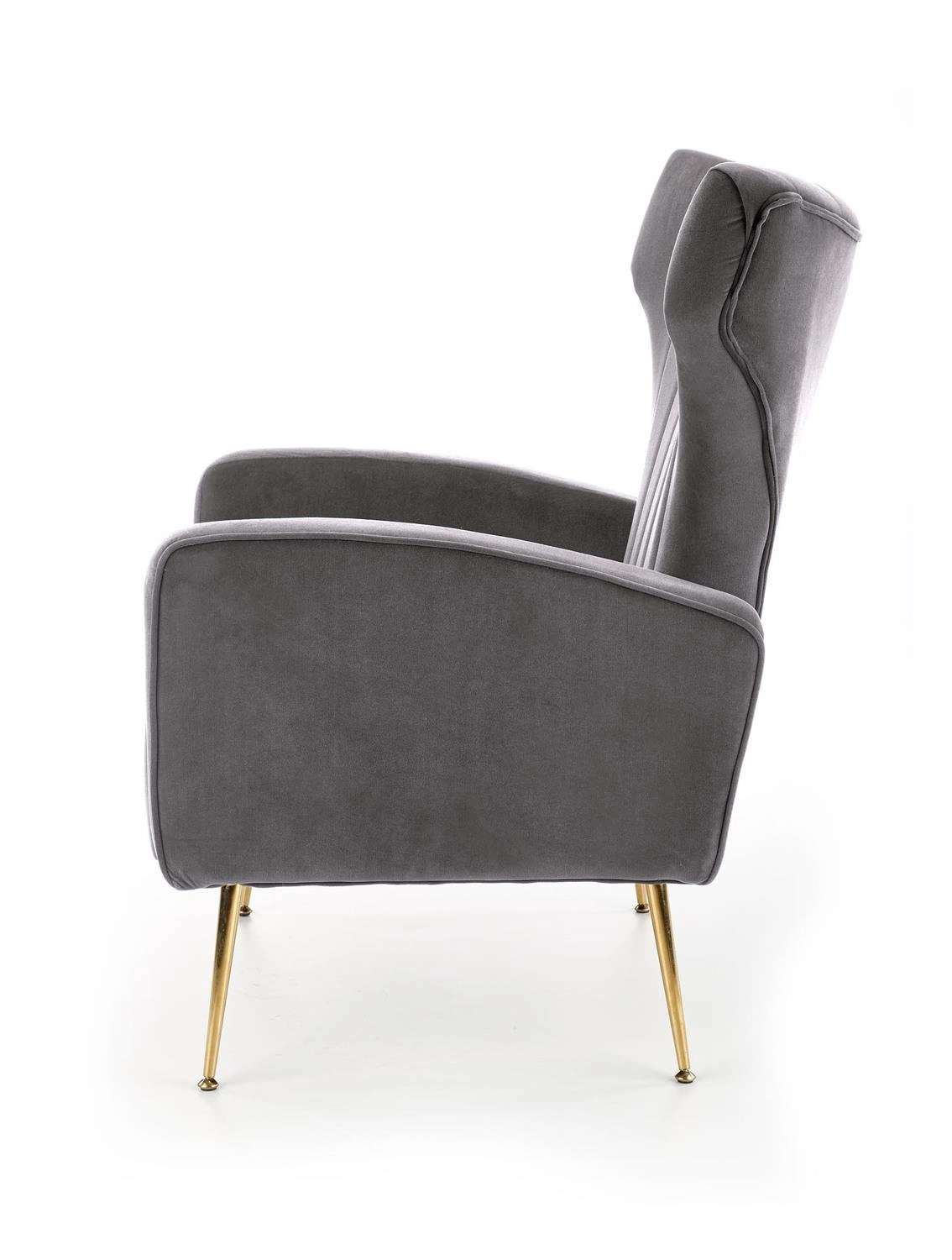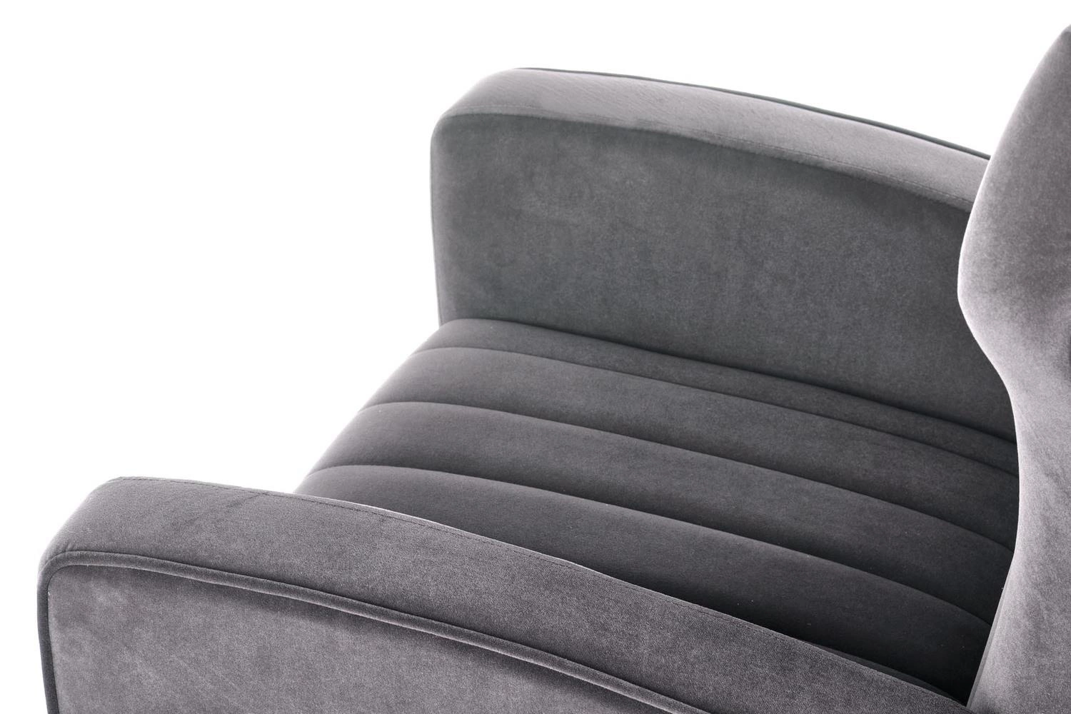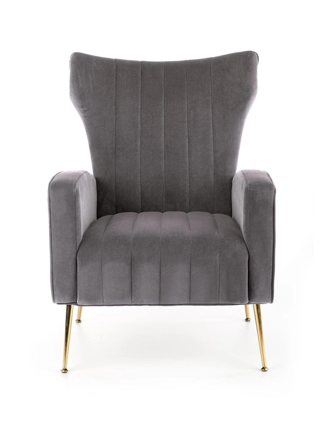 Tmavě šedý samet v kombinaci se zlatou, minimalistickou podstavou vytváří efektní kontrast, který podtrhne charakter moderního obýváku, ložnice či elegantní pracovny. Křeslo Valea nejen zaručuje pohodlí, ale zároveň představuje výrazný dekorativní prvek – hodí se jak do glamour interiérů, tak i do moderně laděných prostor. Štíhlé nohy z nerezové oceli jsou nejen odolné, ale také dodávají celému křeslu lehký vzhled, díky čemuž křeslo nepůsobí robustně ani v menších místnostech.