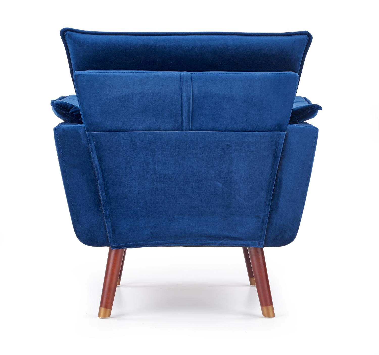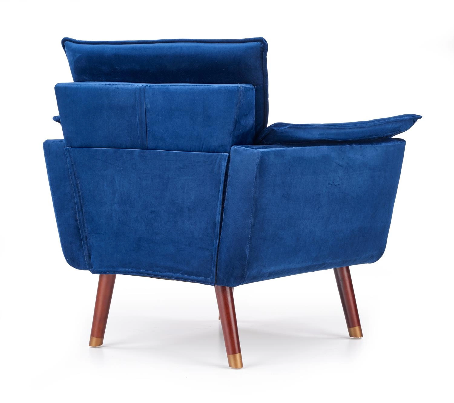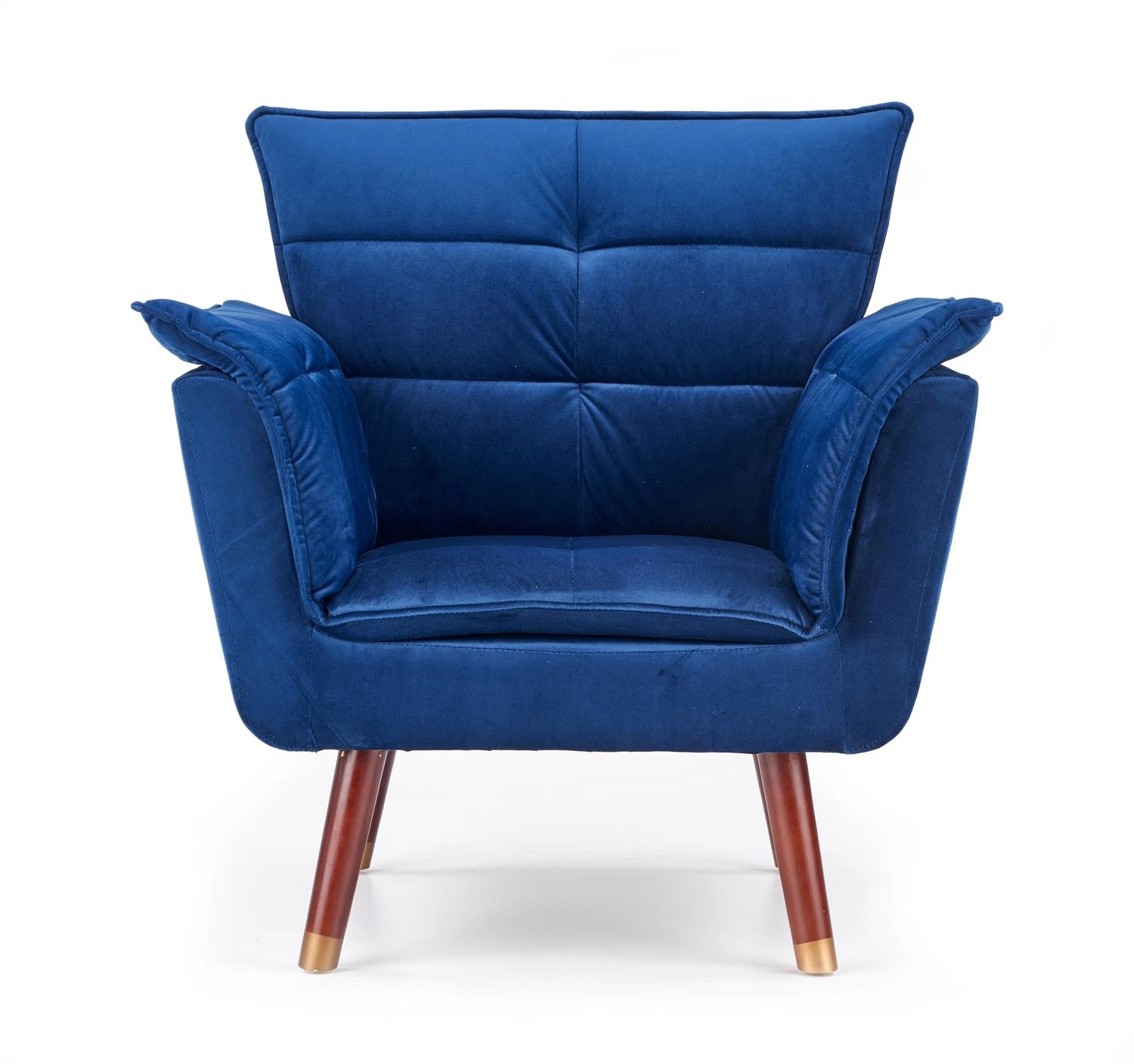 Odpočinkové křeslo Jambo od značky Intesi je moderní nábytek do obývacího pokoje, který zaujme sametovým čalouněním v hlubokém námořnickém odstínu a pohodlným sedákem z čalounické pěny. Štíhlá podnož z kaučukového dřeva v barvě tmavého přírodního dřeva se zlatým detailem dodává celku elegantní vzhled, zatímco ergonomické područky zajišťují komfort při každodenním používání. Šířka 80 cm a výška 84 cm dělají z tohoto křesla ideální volbu do odpočinkové zóny – nabízí maximální pohodlí pro relaxaci, čtení nebo odpolední kávu.
