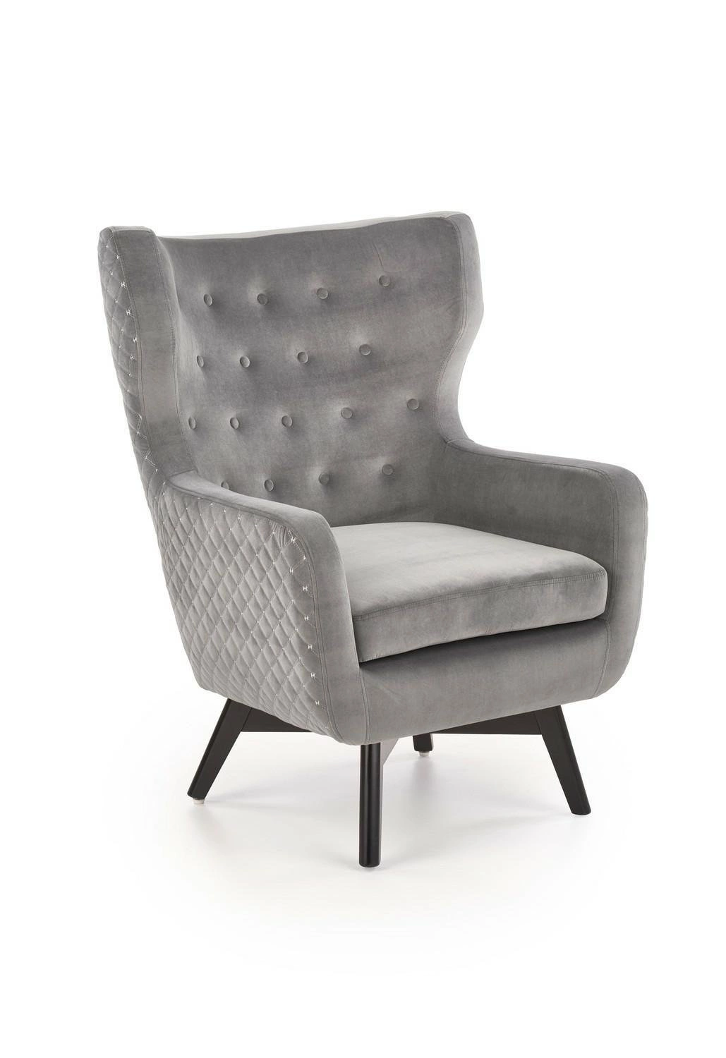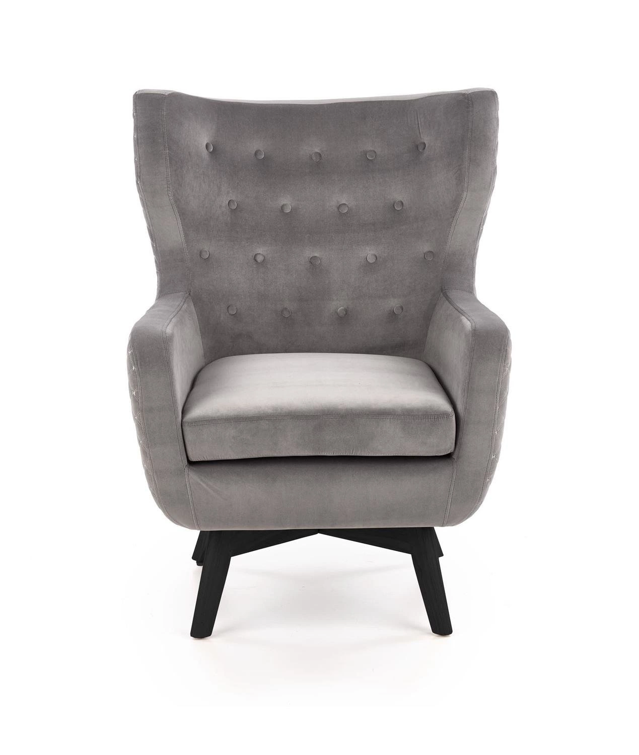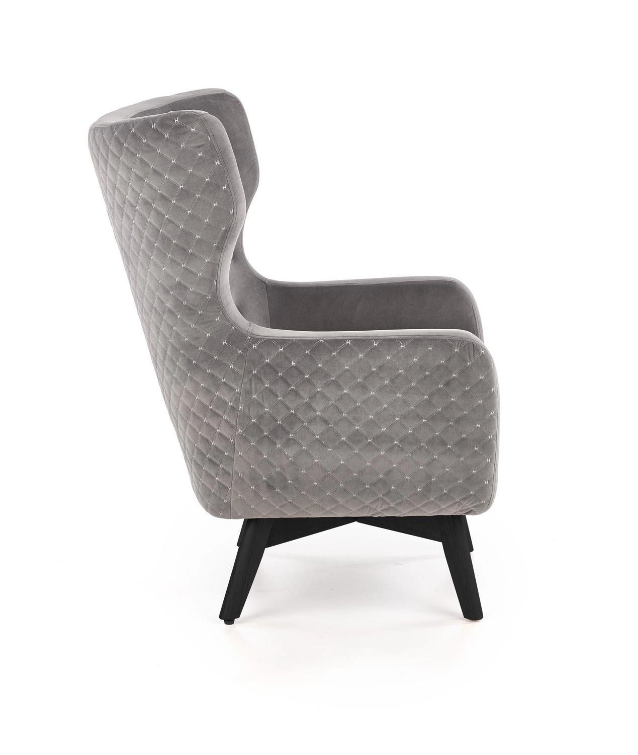 Křeslo ušák Farys značky Intesi je stylové a pohodlné křeslo do obývacího pokoje, čalouněné měkkou sametovou látkou ve světle šedém odstínu. Vysoké opěradlo, široké sedadlo a komfortní područky zajišťují maximální relaxaci, zatímco černá dřevěná základna poskytuje stabilitu a dlouhou životnost. Rozměry 75 × 83 × 103 cm dělají z tohoto kusu nábytku ideální relaxační křeslo nejen do obýváku, ale také do ložnice či domácí pracovny.