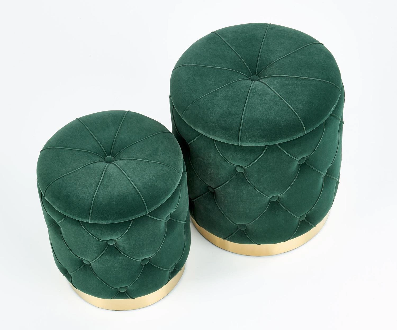 Sada 2 taburetů Grena od značky Intesi je dokonalým spojením moderního glamour stylu, praktičnosti a pohodlí. Kulaté taburety o výšce 44 cm a průměru 40 cm jsou čalouněné měkkou látkou v tmavě zelené barvě, doplněné o praktické úložné prostory a stabilní zlatý ocelový podstavec. Ideální volba jak do obývacího pokoje, tak i do předsíně – všude tam, kde oceníte komfort, styl a extra místo na uložení věcí.