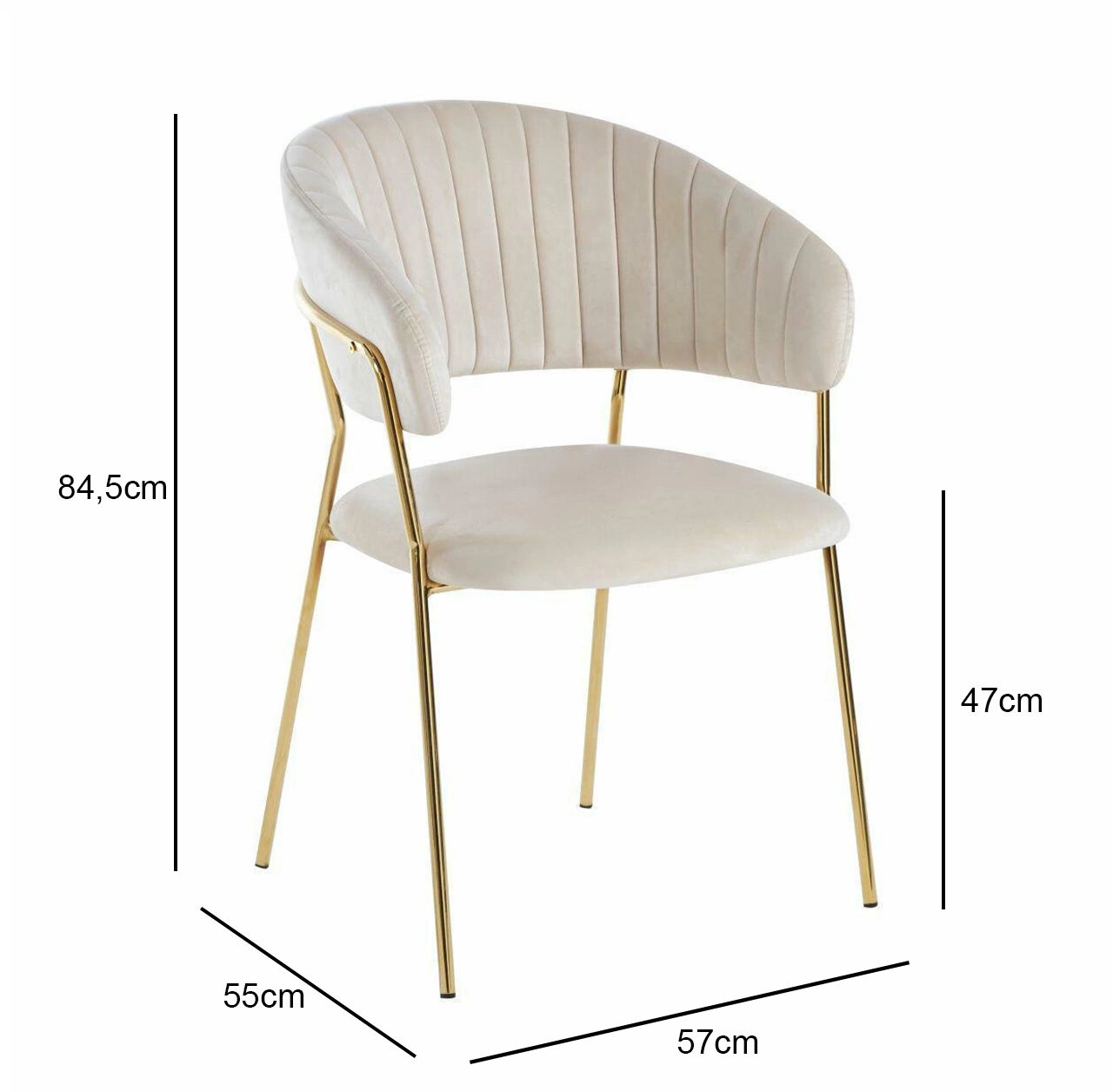 Čalouněná židle Glamour Velvet od značky Intesi je spojením elegance, pohodlí a moderního designu. Tento model zaujme béžovým sametovým čalouněním, zlatými nohami s lesklou povrchovou úpravou a praktickými područkami. Židle o rozměrech 84,5 × 57 × 55 cm s pohodlným sedákem ve výšce 47 cm je ideální jako stylová židle do jídelny, obývacího pokoje, kuchyně nebo do luxusní restaurace.