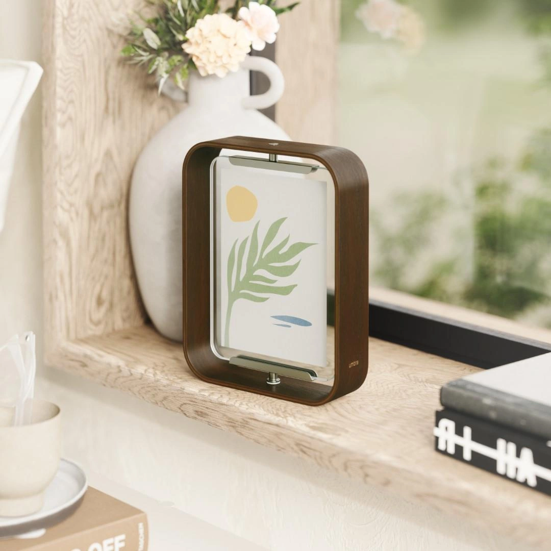 Rámeček na fotografie 13x18 Bellwood Umbra spojuje moderní eleganci s přírodním skandinávským stylem. Vyrobený z bukového a topolového dřeva v ořechovém odstínu, doplněný sklem a kovem, vytváří stylový rámeček pro vaše nejdůležitější vzpomínky. Unikátní otočná konstrukce umožňuje snadno měnit vystavení fotografií o rozměru 13x18 cm, takže je ideálním doplňkem na pracovní stůl, komodu nebo polici v obývacím pokoji, předsíni či kanceláři.