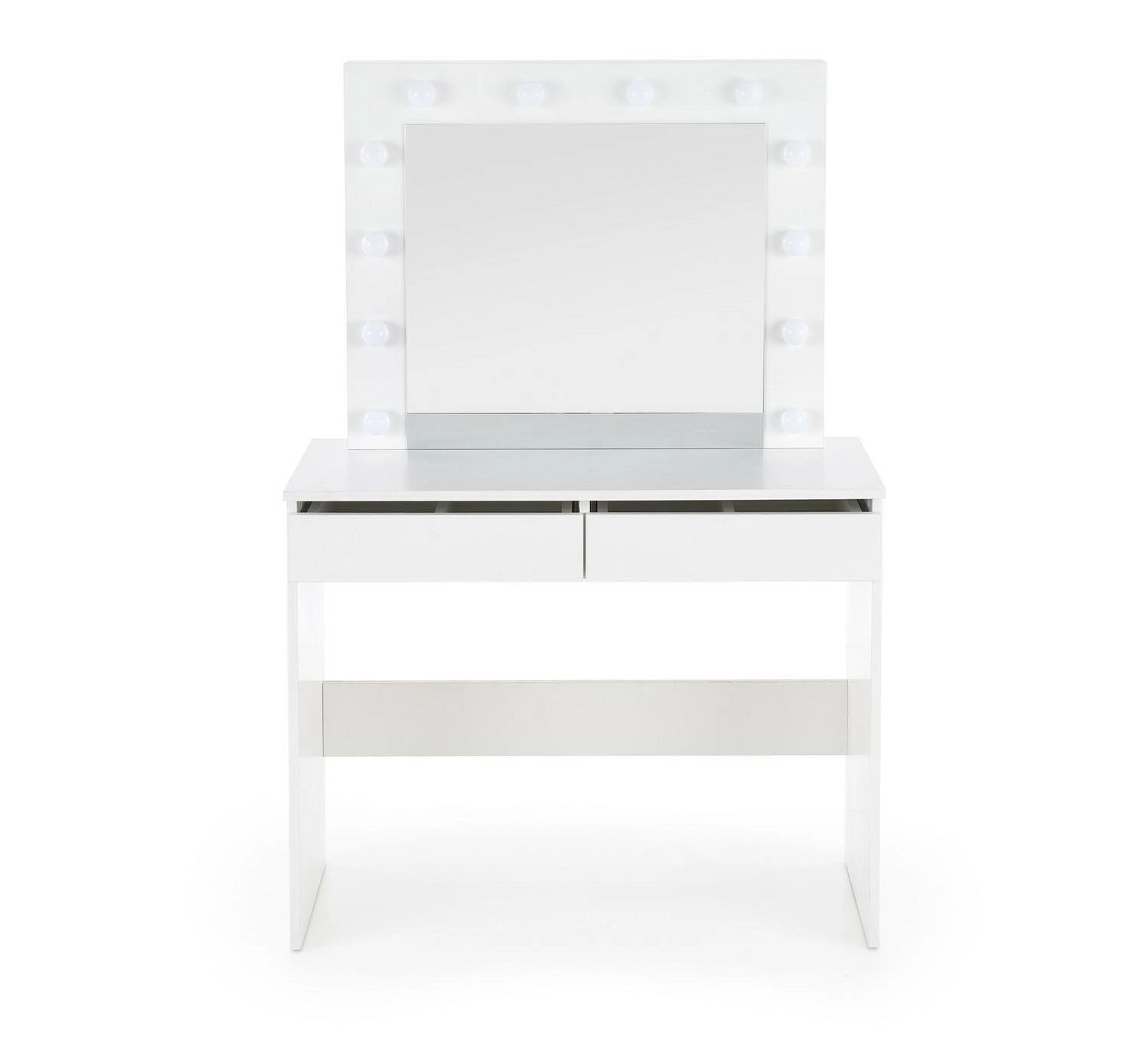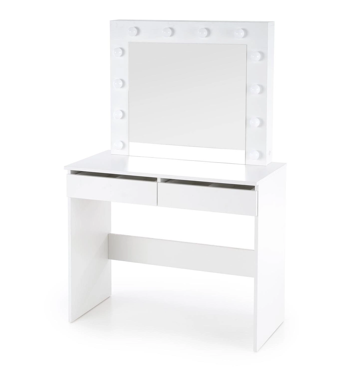 Moderní toaletní stolek s LED zrcadlem Sybilla od značky Intesi je perfektním spojením funkčnosti a minimalistického designu. Je vyrobený z odolné nábytkové desky v čistě bílé barvě a vybavený velkým zrcadlem s integrovaným LED osvětlením. Tento stylový a praktický toaletní stolek je ideální volbou do každé ložnice. Šířka 94 cm a dvě prostorné zásuvky umožňují pohodlné ukládání kosmetiky i doplňků na líčení.