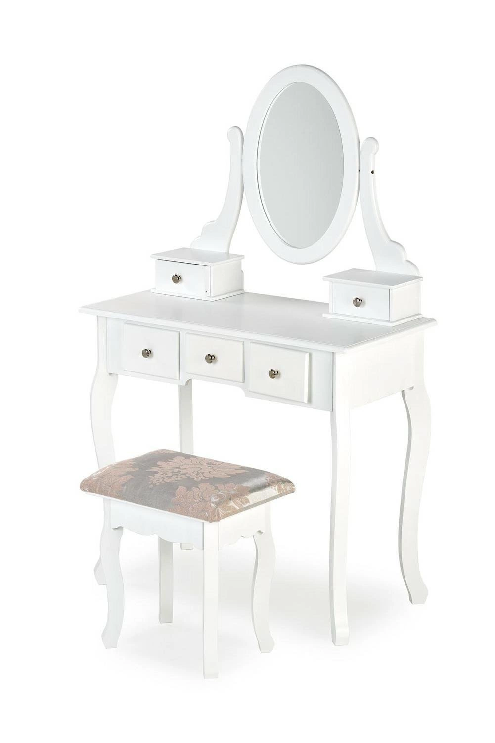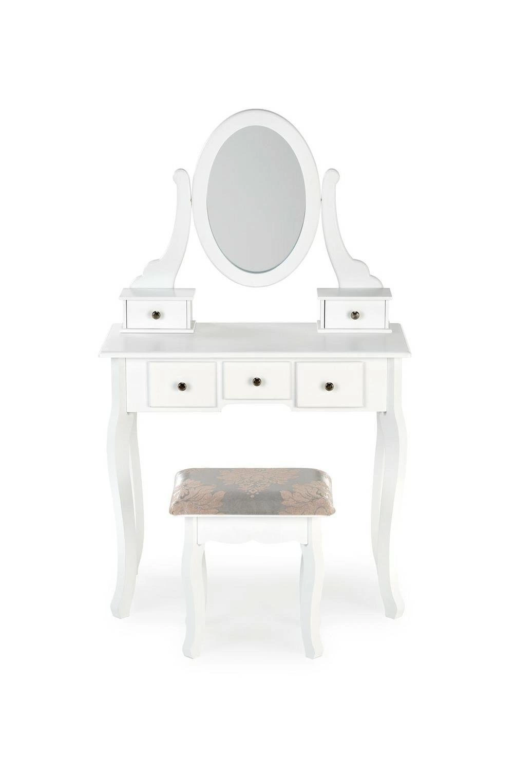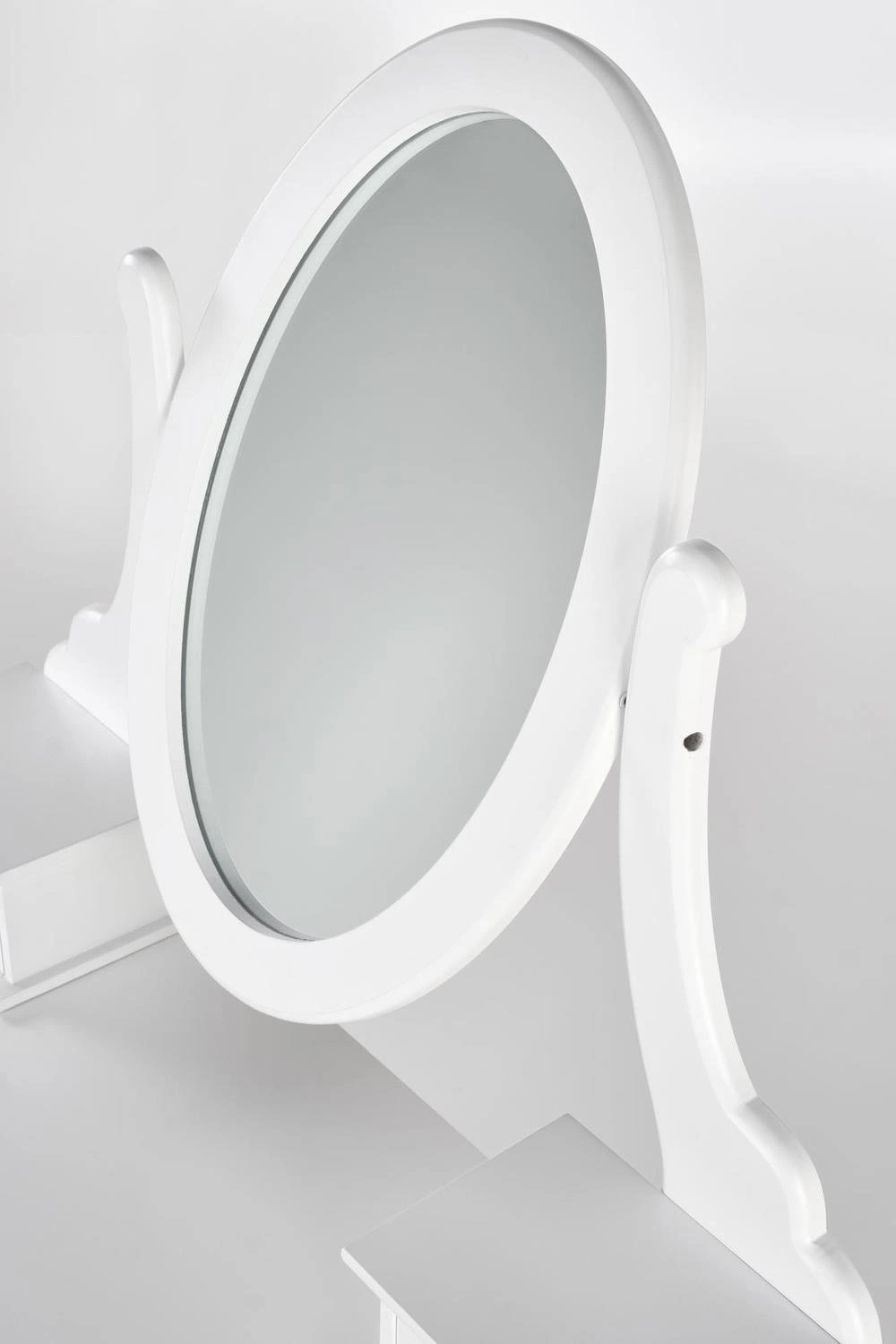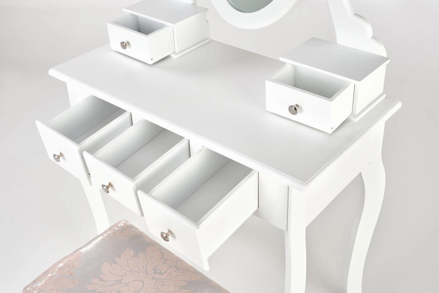 Bílý toaletní stolek Elsa s oválným zrcadlem a taburetem, glamour na líčení se zásuvkami