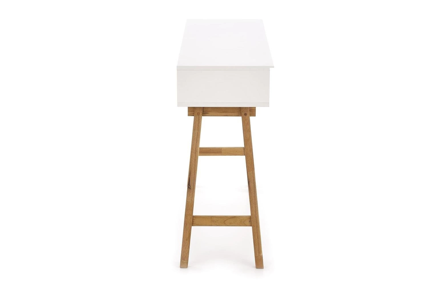 Konzole Indigo od značky Intesi je spojením funkčnosti a skandinávské estetiky v jednom nadčasovém nábytku. Vyrobena z hladké, matné bílé desky umístěné na pevných nohách z přírodního dřeva nabízí praktickou zásuvku a prostornou polici. S rozměry 110 cm na šířku, 35 cm do hloubky a 80 cm na výšku je tento úzký konzolový stolek ideální volbou jak do předsíně, tak do obývacího pokoje či ložnice – skvěle poslouží také jako moderní toaletní stolek nebo elegantní stolek ke zdi pod zrcadlo.