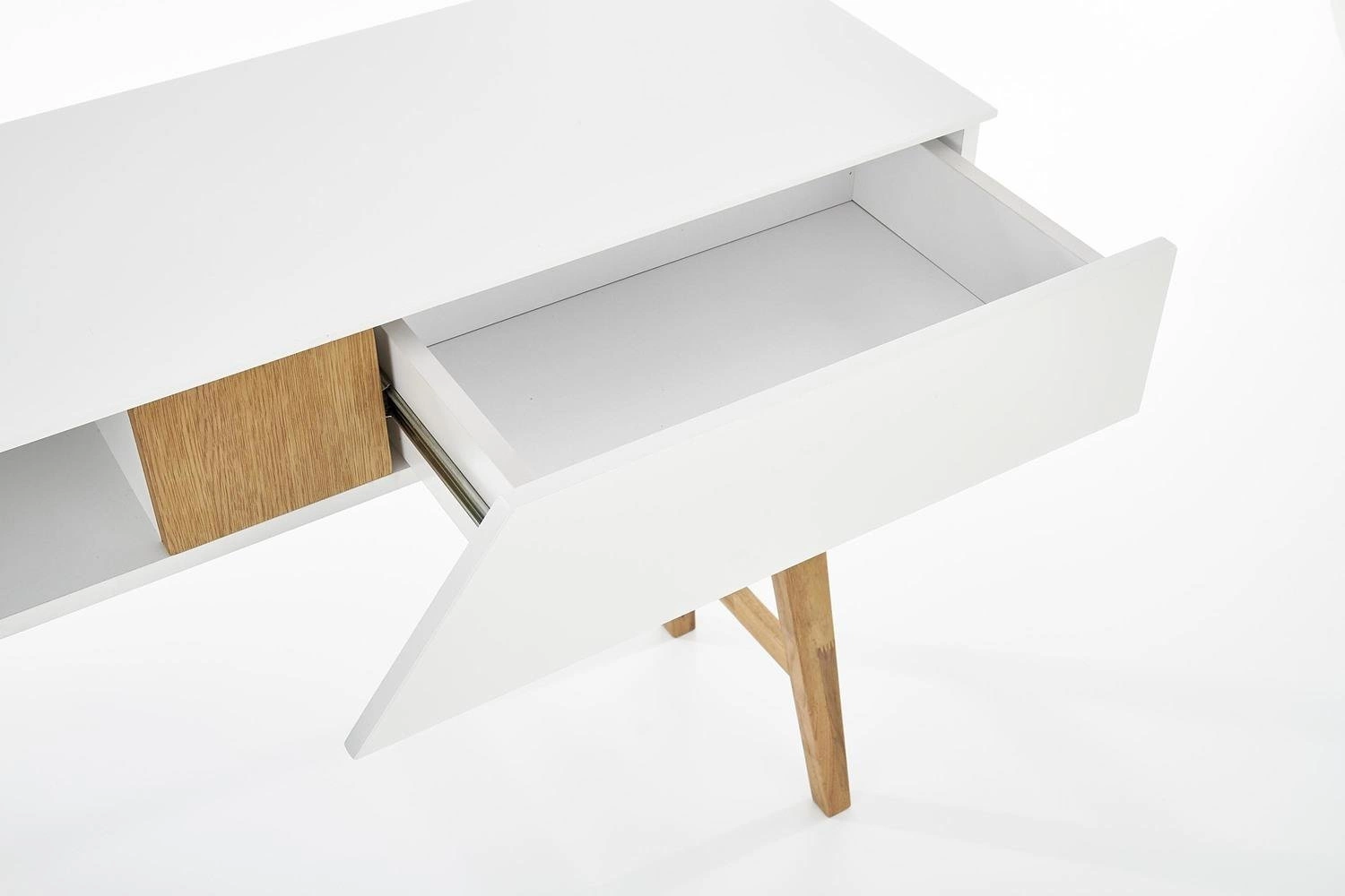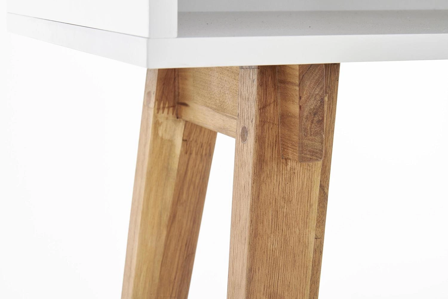 Konzole Indigo zaujme jednoduchým tvarem a decentním kontrastem bílé barvy s přírodním dřevem. Typické, štíhlé nohy z masivu nejen působí vzdušně, ale také usnadňují úklid – pod nábytkem snadno projede robotický vysavač. Hladká čelní strana a matné provedení podtrhují minimalistický skandinávský styl, který prosvětlí každý interiér a dodá mu útulnou atmosféru.