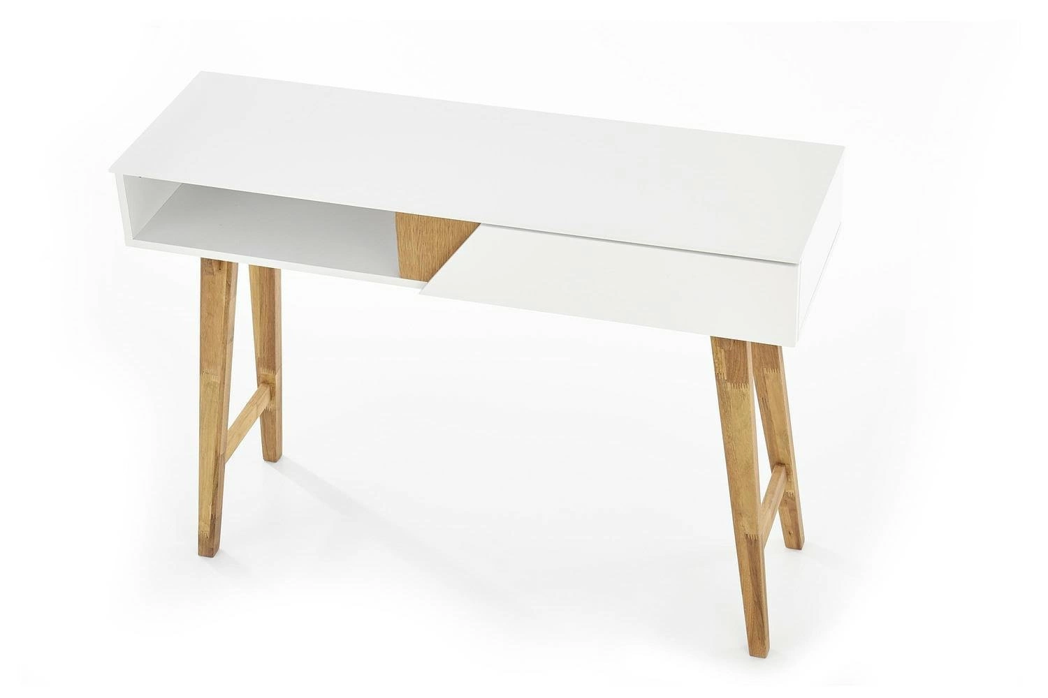 Indigo - nábytek ve skandinávském stylu Konzola Indigo je harmonickou kombinací praktičnosti a estetiky. Tato elegantní konzola s rozměry 110/35/80 cm je dokonalým doplňkem interiéru ložnice, obývacího pokoje nebo předsíně. Její všestrannost jde ještě dál, protože ji lze použít jako praktický toaletní stolek. Bílá matně lakovaná deska z MDF nejenže vypadá rafinovaně, ale také zajišťuje snadnou údržbu. Podstavec z masivního dřeva v přírodním odstínu tvoří harmonické pozadí minimalistického designu. Zásuvka a police poskytují praktický úložný prostor pro různé předměty a pomáhají udržovat pořádek v místnosti. Konzola Indigo je vynikajícím příkladem toho, jak může funkčnost kosk.ace s estetikou. Její čisté linie a jednoduchost znamenají, že dokonale zapadne do minimalistického interiéru. Ať už ji využijete k vystavení dekorací, uložení drobností nebo jako toaletní stolek, tato konzole není jen kusem nábytku, ale také designovým akcentem interiéru. Ujistěte se, že je to ta správná volba! Konzola Indigo v sobě spojuje praktičnost a estetiku a vytváří tak harmonický kus nábytku. Multifunkčnost konzoly umožňuje její použití v ložnici, obývacím pokoji nebo předsíni, stejně jako jako toaletního stolku. Lakovaná horní deska z MDF a základna z masivního dřeva zaručují odolnost a eleganci. Minimalistické odstíny bílé a přírodního dřeva se dokonale hodí ke skandinávským a moderním aranžmá. Konzola Indigo je nejen praktickým úložným prostorem, ale také designovým prvkem, který se hodí do různých interiérů a dodá jim eleganci a charakter.