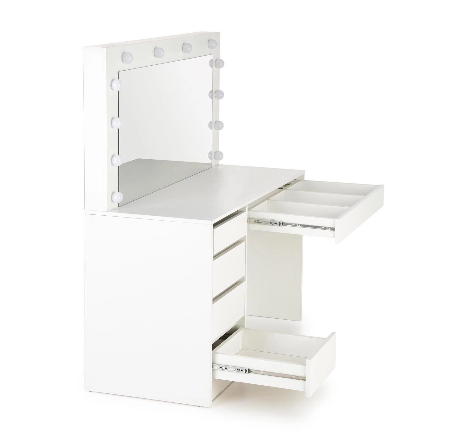 Pět prostorných zásuvek umožňuje snadné uspořádání veškeré potřebné kosmetiky, šperků nebo doplňků na styling. Široká pracovní plocha nabízí dostatek prostoru pro rozložení všech pomůcek a pevná konstrukce garantuje stabilitu při každodenním používání. Výška stolku – 140 cm – zaručuje pohodlí při sezení i při práci ve stoje.