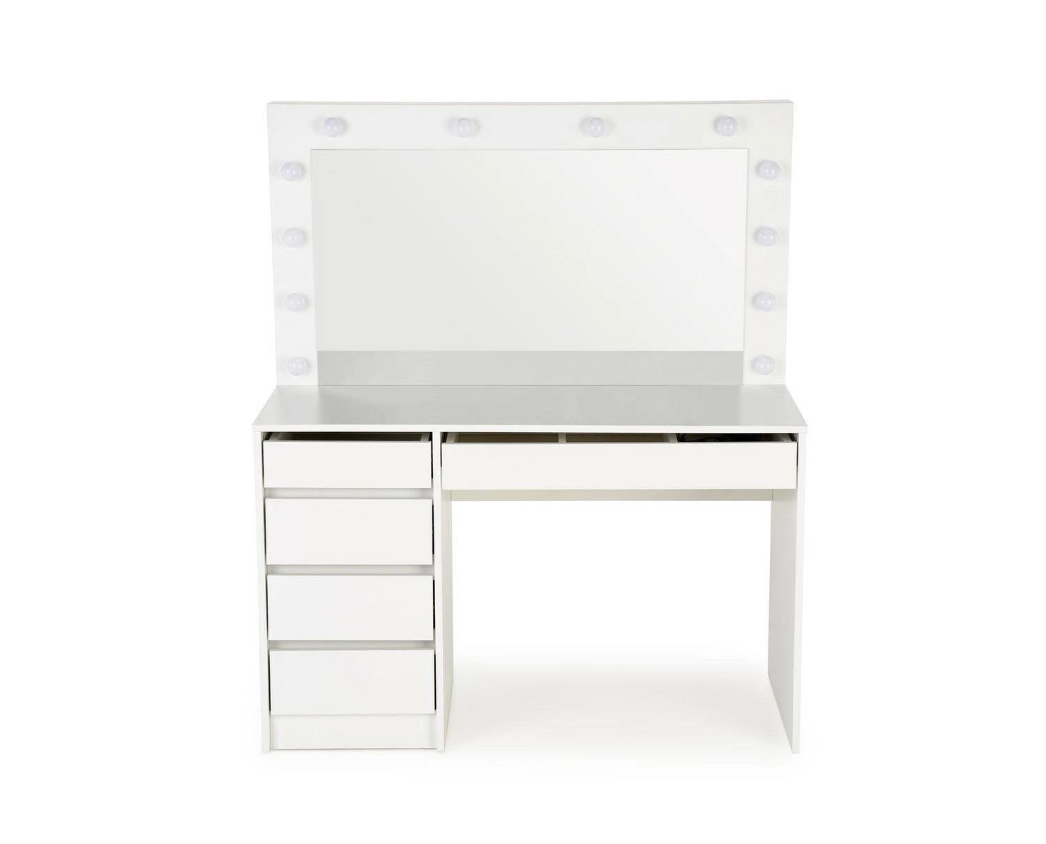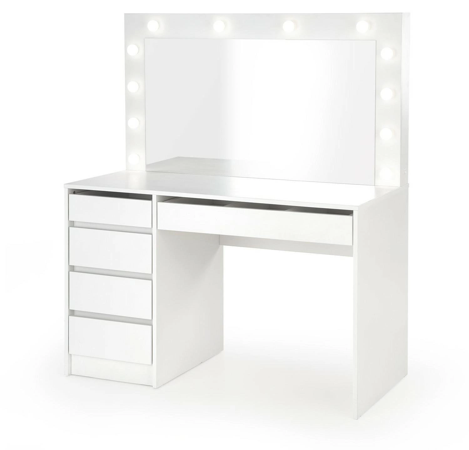 Moderní toaletní stolek s LED zrcadlem Sybilla XL od značky Intesi je ideální volbou do ložnice, která spojuje minimalistický design s praktickými řešeními. Je vyrobený z odolné nábytkové desky v elegantní bílé barvě a nabízí velkou pracovní plochu (120×55 cm) a až pět prostorných zásuvek, díky nimž snadno uspořádáte kosmetiku i doplňky na líčení. Srdcem toaletního stolku Sybilla XL je integrované zrcadlo s moderním LED podsvícením, které poskytuje optimální světlo pro každodenní kosmetické rituály.