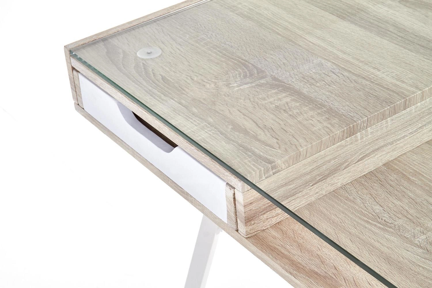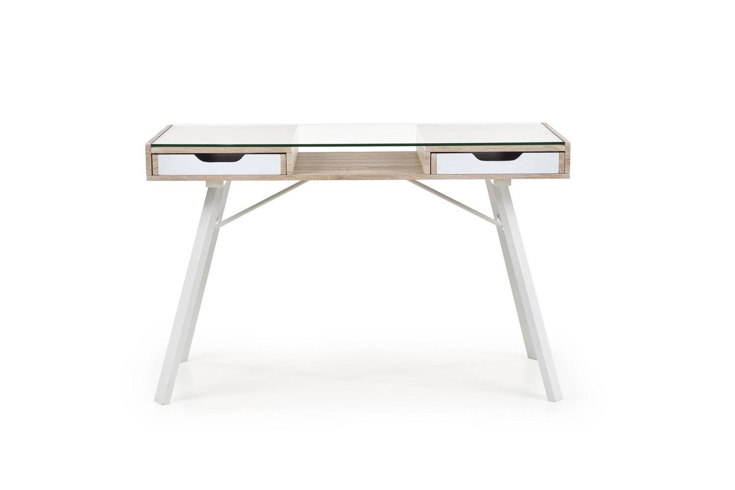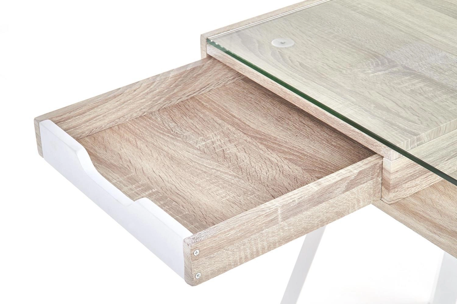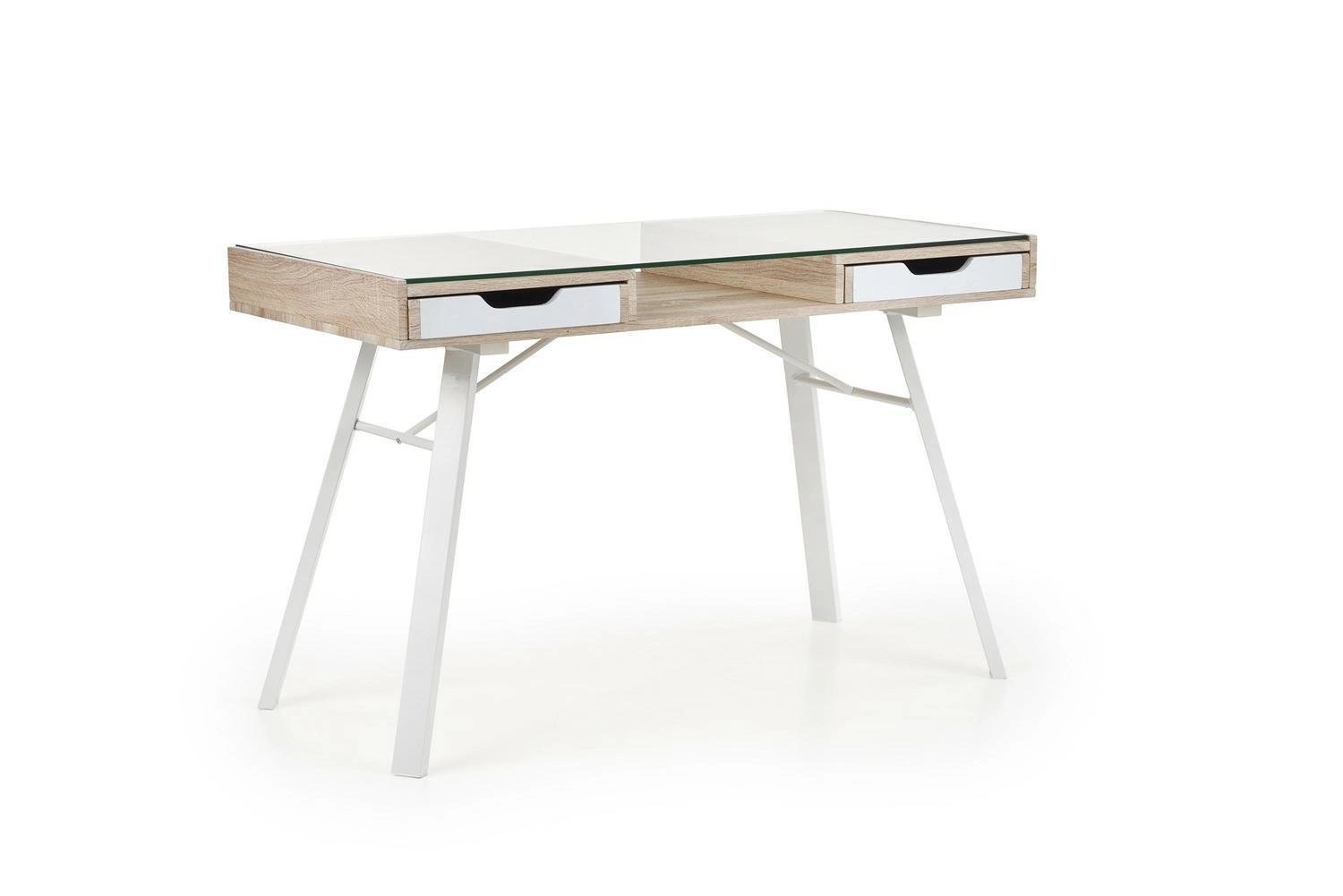 Kombinace přírodního odstínu dubu sonoma a bílé barvy spolu s čirou skleněnou deskou zajišťuje, že psací stůl Sabal skvěle zapadne do populárního skandinávského stylu. Lehká konstrukce na čtyřech nohách a absence zbytečných ozdob dávají interiéru nádech svěžesti a opticky jej zvětšují. Díky univerzálním barvám a minimalistickému designu se stůl skvěle hodí jak do světlých obývacích pokojů, tak i do menších ložnic či studentských pokojů.