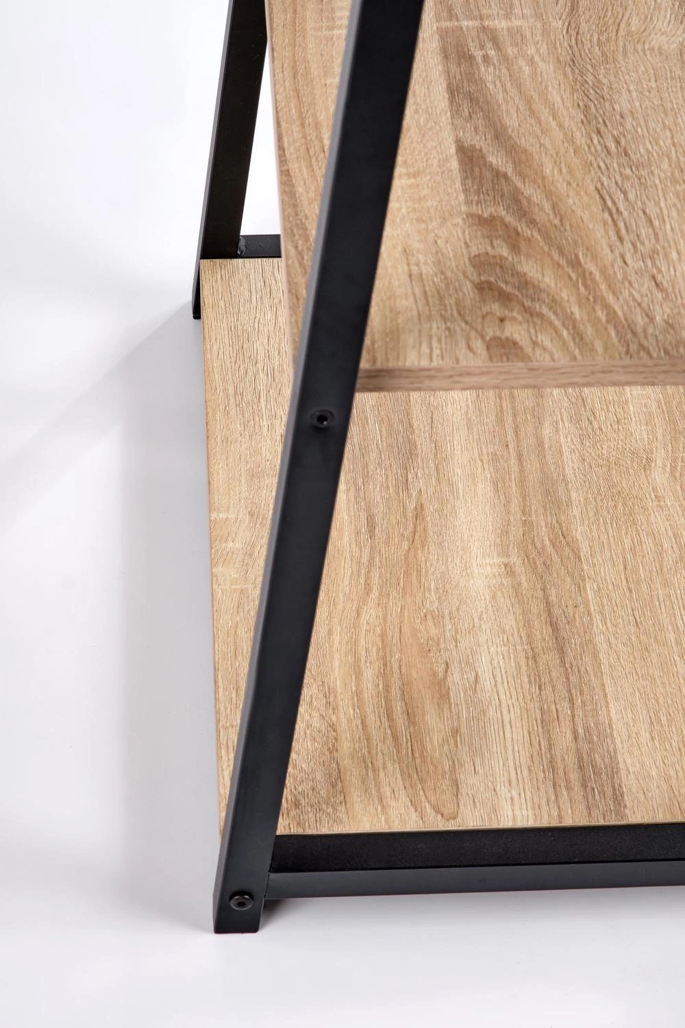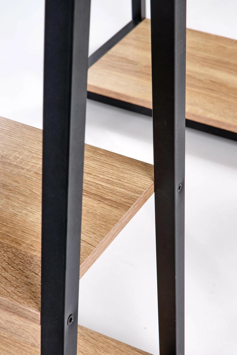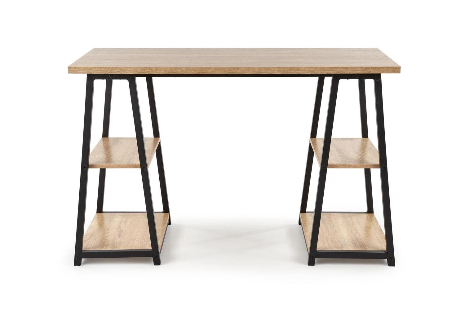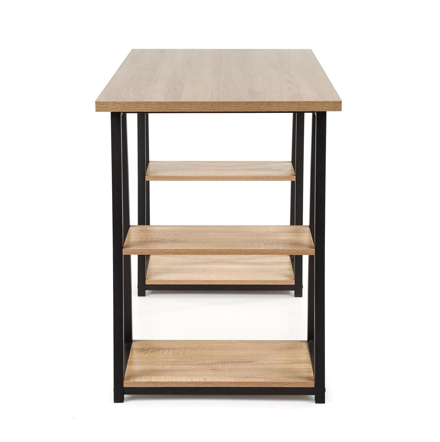 Psací stůl Womp - elegance a funkčnost v jednom Psací stůl Womp v elegantní kombinaci dubu sonoma a černé barvy je dokonalým řešením pro ty, kteří hledají ve svém prostředí funkčnost i moderní design. Značné rozměry 120/60/77 cm poskytují dostatek prostoru pro práci, tvorbu nebo studium, zatímco jeho neobvyklý design mu dodává jedinečný charakter. Základem konstrukce stolu je masivní dýhovaná nábytková deska, která zajišťuje trvanlivost a odolnost vůči každodennímu používání. Podnož z práškově lakované oceli v černé barvě vytváří kontrastní akcent, který dodává stolu moderní výraz. Pozornost však nepřitahuje pouze estetika - stůl Womp vyniká také svým inovativním řešením. Mezi jeho nohami se nacházejí dvě police, které vytvářejí praktický úložný prostor. Celkem má stůl čtyři police - dvě na každé straně. Chytré řešení, které pomáhá udržovat pořádek na pracovišti. Stůl Womp se skvěle hodí do moderních a loftových interiérů. Skvěle se hodí do designové kanceláře, kreativního studia nebo pokoje pro mladé, kde jdou funkčnost a styl ruku v ruce. Jeho jedinečná forma v kombinaci s praktičností z něj dělá místo pro práci i inspiraci. Stojí za to si ho zapamatovat! Psací stůl Womp kombinuje funkčnost s moderním vzhledem. Stůl je vyroben z dýhované nábytkové desky a práškově lakované oceli a poskytuje odolnost a pevnost. Čtyři police mezi nohami nábytku vytvářejí praktický úložný prostor a pomáhají udržovat pořádek. Skvěle se hodí do loftových a moderních interiérů, ideální do designové kanceláře nebo pokoje pro mládež. Rozměry 120/60/77 cm poskytují pohodlnou plochu pro práci, tvoření nebo studium a zároveň jsou zdrojem inspirace.