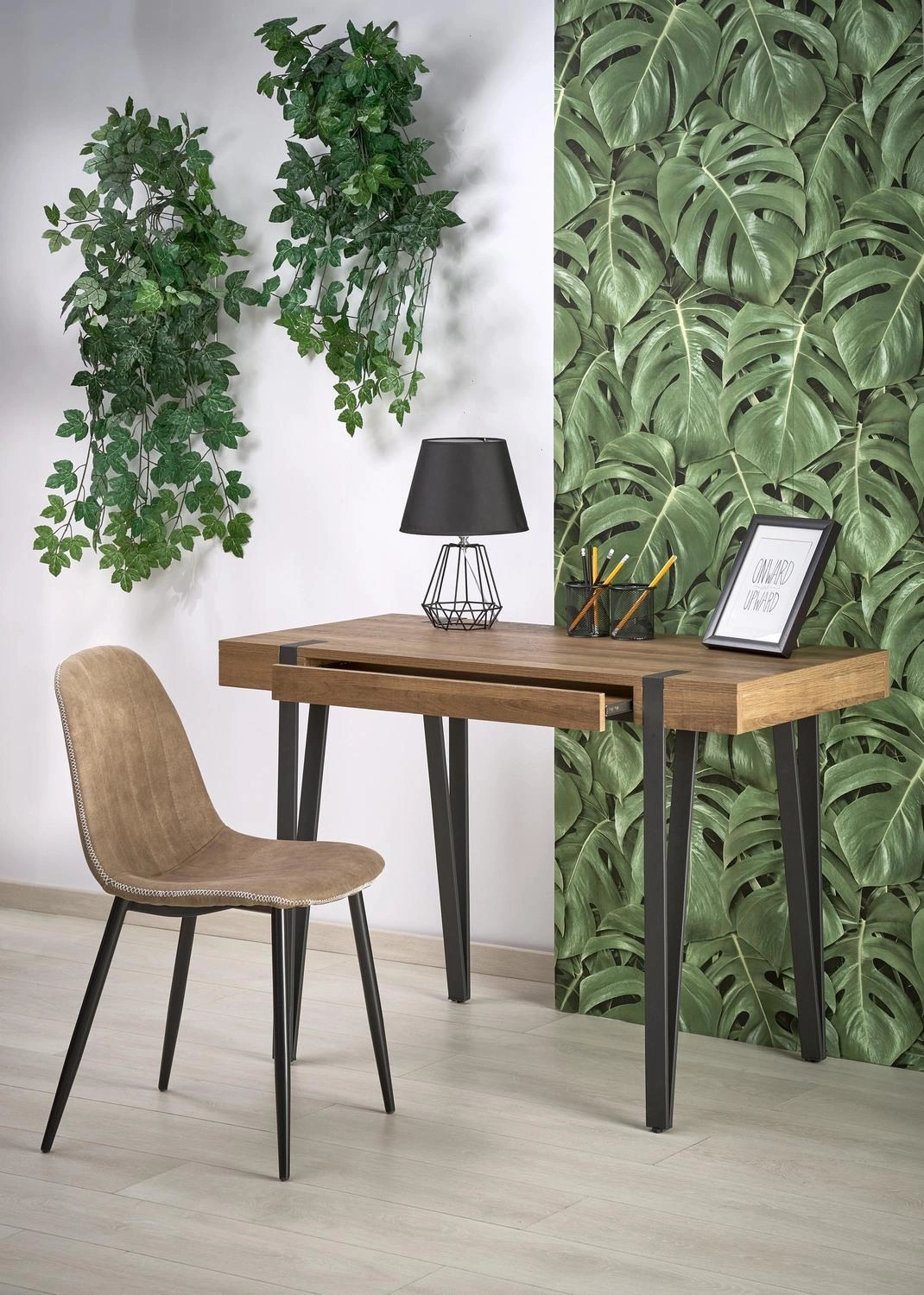 Pracovní stůl Indorika od značky Intesi je stylový a funkční nábytek o rozměrech 110×55×76 cm, který spojuje moderní design s loftovým charakterem. Deska v odstínu medového ořechu na černé ocelové podnoži vytváří výrazný kontrast a praktická, prostorná zásuvka usnadňuje udržení pořádku. Tento kompaktní psací stůl je ideální jak do domácí pracovny, tak i do moderní kanceláře nebo studentského pokoje.