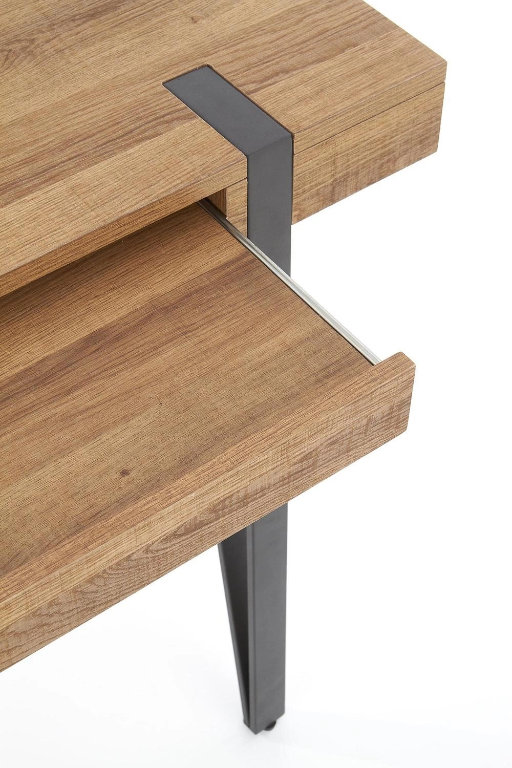 Psací stůl Indorika - elegance a funkčnost pro moderní interiéry Psací stůl Indorika je harmonickou kombinací elegance a praktičnosti, která dodá charakter každému prostoru. Tento kus nábytku je vyroben z laminované MDF a práškově lakované oceli, což zaručuje estetiku i odolnost. Barevná kombinace - medový ořech a černá - vytváří kontrastní spojení, které dodává interiéru jedinečnou hloubku. Stůl Indorika je příkladem funkčnosti v elegantním designu. Je vybaven zásuvkou a nabízí praktický úložný prostor, který vám umožní udržovat pořádek na pracovišti. Zajímavým designovým prvkem jsou neobvyklé černé nohy, které dodávají nábytku moderní charakter a vytvářejí decentní akcent. Tento psací stůl je vynikající volbou do mnoha interiérů, zejména do moderního a loftového stylu. Díky svému jedinečnému designu a kontrastním barvám se stane nejen praktickým místem pro práci, ale také estetickým akcentem v bytě. Přesvědčte se, že je to dobrá volba! Stůl Indorika je vyroben z laminované MDF desky a práškově lakované oceli, což vytváří estetický a odolný kus nábytku. Medový ořech a černá barva vytvářejí atraktivní kontrast a dodávají interiéru jedinečnou hloubku. Stůl je vybaven zásuvkou a nabízí úložný prostor, který pomáhá udržovat pořádek. Neobvyklé černé nohy dodávají stolu charakter a moderní vzhled. Stůl lze použít jako funkční pracovní stůl nebo elegantní toaletní stolek, čímž se přizpůsobí různým potřebám interiéru.