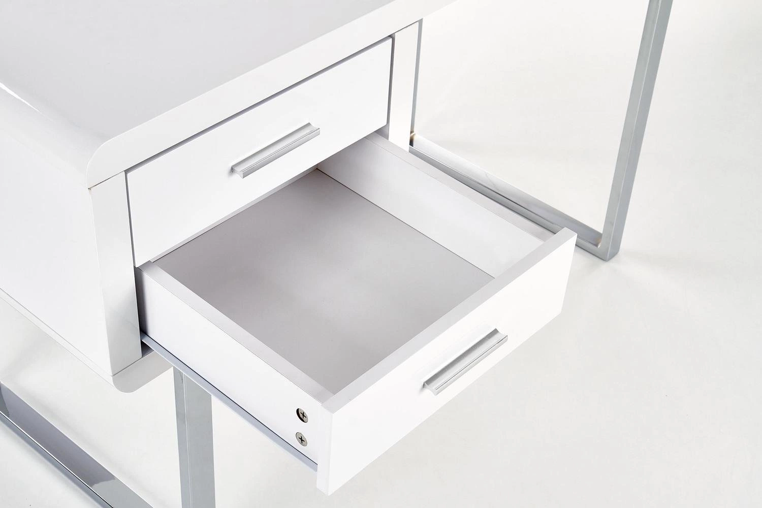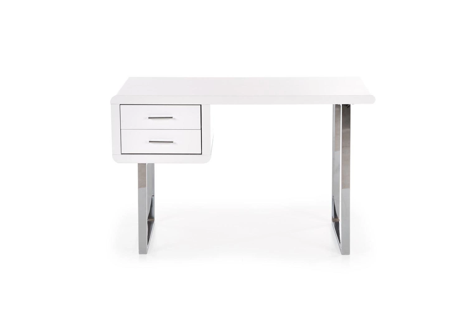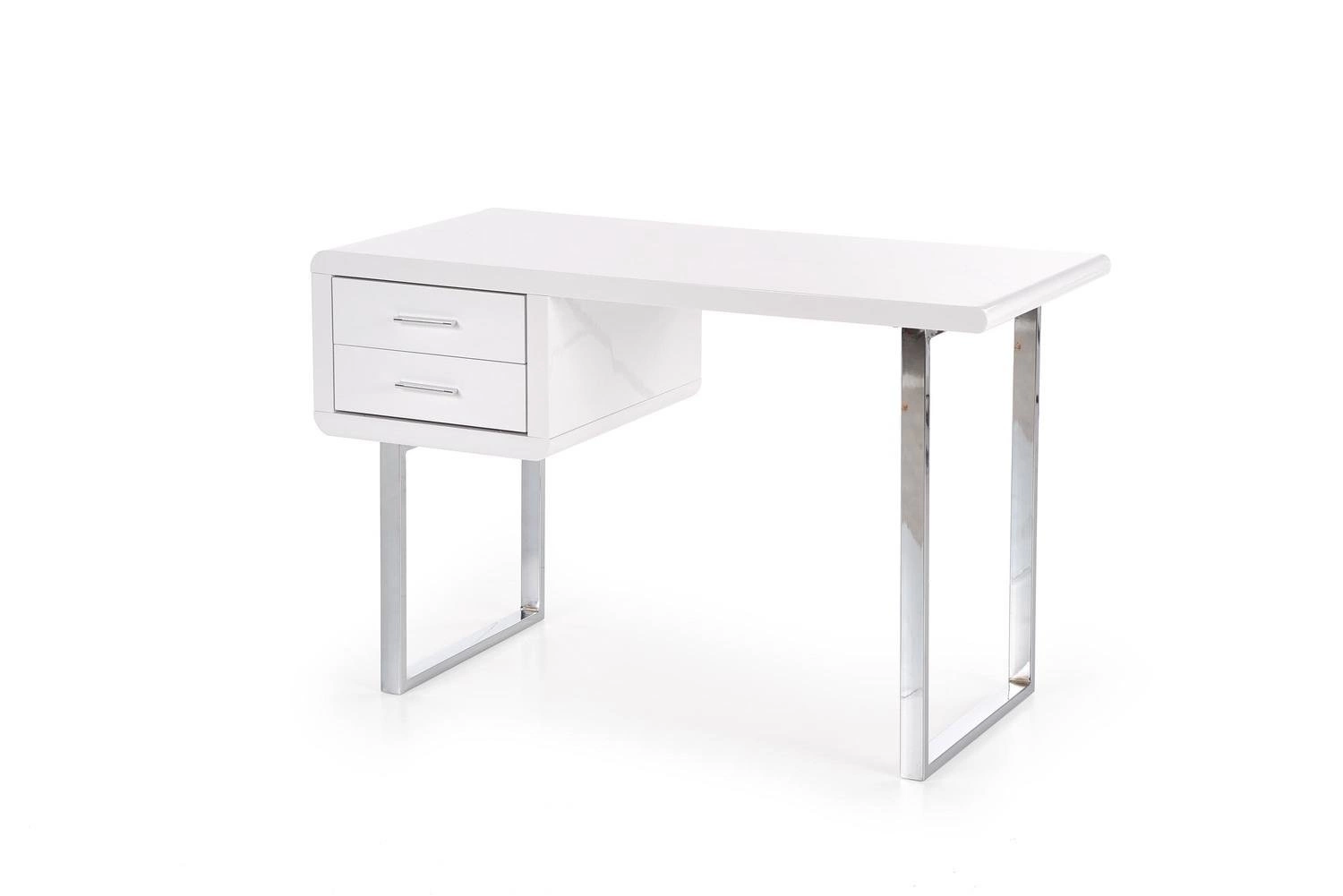 Psací stůl Gala se skvěle hodí do moderních i glamour interiérů, vyniká sněhově bílou deskou s efektním leskem a lehkou chromovanou podnoží. Tato kombinace barev a materiálů nejenže prosvětluje místnost, ale také ji opticky zvětšuje a dodává jí exkluzivní nádech. Šířka 120 cm a hloubka 55 cm poskytují komfortní prostor pro jakoukoliv činnost – od práce na počítači, přes studium až po kreativní projekty.