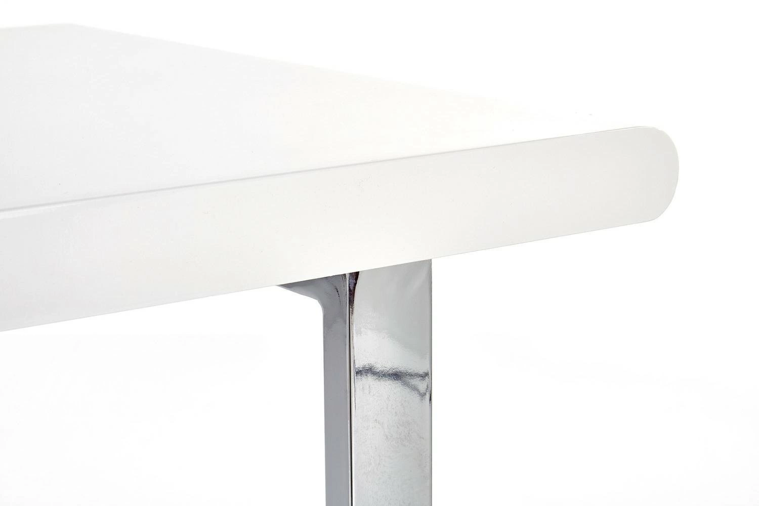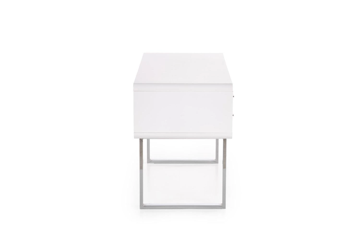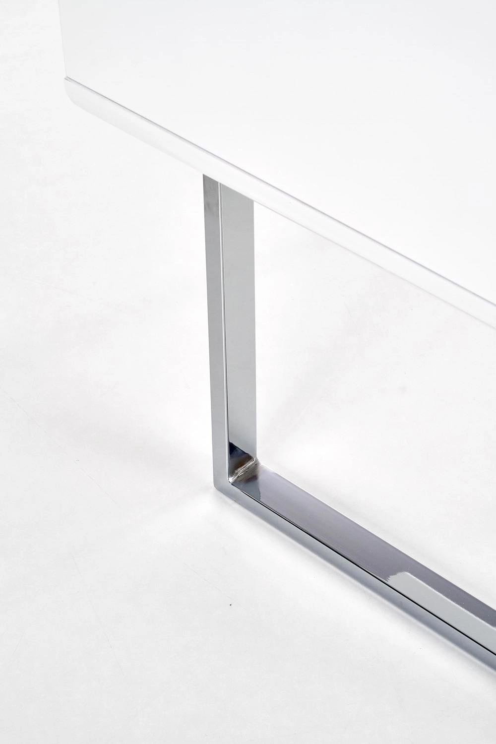 Psací stůl Gala se skvěle hodí do moderních i glamour interiérů, vyniká sněhově bílou deskou s efektním leskem a lehkou chromovanou podnoží. Tato kombinace barev a materiálů nejenže prosvětluje místnost, ale také ji opticky zvětšuje a dodává jí exkluzivní nádech. Šířka 120 cm a hloubka 55 cm poskytují komfortní prostor pro jakoukoliv činnost – od práce na počítači, přes studium až po kreativní projekty.