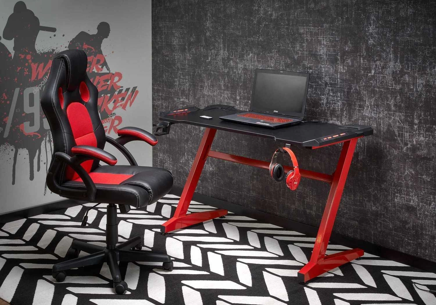 Herní stůl Intesi Gamer je moderní nábytek o rozměrech 122×60×74 cm, navržený pro milovníky počítačových her a mladé lidi hledající funkční místo na práci nebo studium. Vyniká pevným deskou v hluboké černé barvě, odolnou kovovou konstrukcí v energické červené a působivým LED podsvícením, které každé herní seanci dodává jedinečnou atmosféru. Praktické držáky na nápoj a příslušenství zajišťují, že vše potřebné máte vždy po ruce.