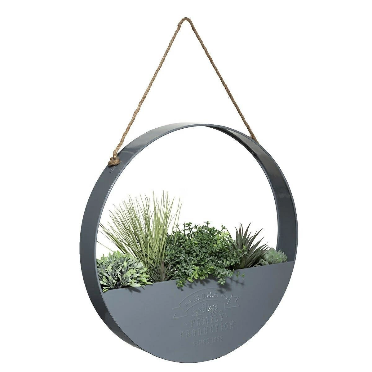 Nástěnný květináč z kovu Atmosphera je rustikální dekorace do obývacího pokoje o průměru 44 cm, vyrobená z odolného kovu a plastu, vyplněná realistickými sukulenty. Díky promyšlenému designu a jemné kombinaci šedé a zelené barvy se tento závěsný květináč stává výjimečnou ozdobou interiéru, která vnáší útulnost a přírodní akcent bez nutnosti péče o květiny.