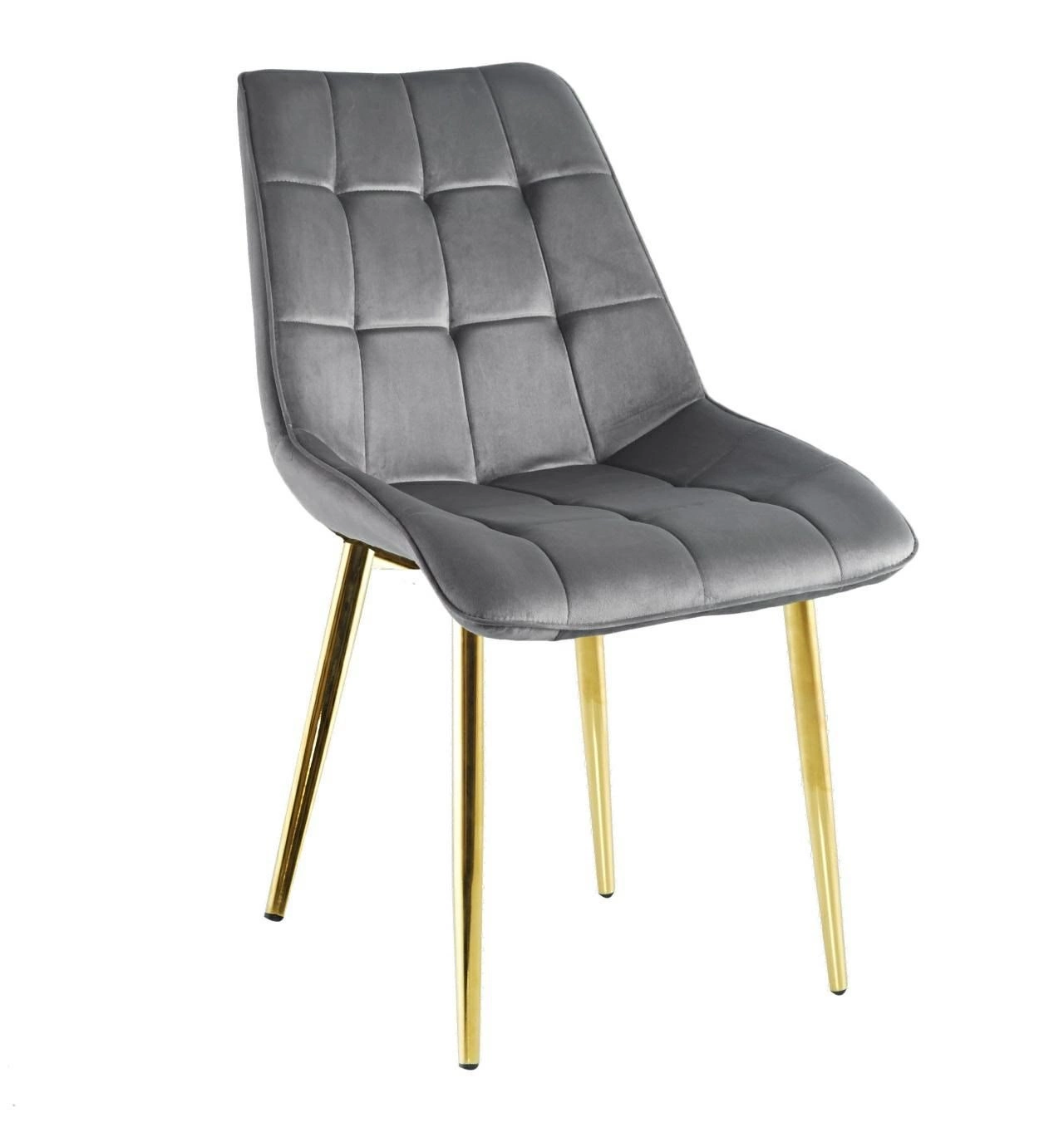 Jídelní židle Poly od značky Intesi je synonymem moderního glamour stylu v každodenním provedení. Čalounění z příjemně jemného, světle šedého sametu zaujme elegantním prošíváním a zlatou, vysoce lesklou podnoží. Díky ergonomickému tvaru a stabilní konstrukci na čtyřech kovových nohách je tato sametová židle ideální nejen ke stolu v jídelně, ale také do moderní kuchyně nebo stylového obývacího pokoje.