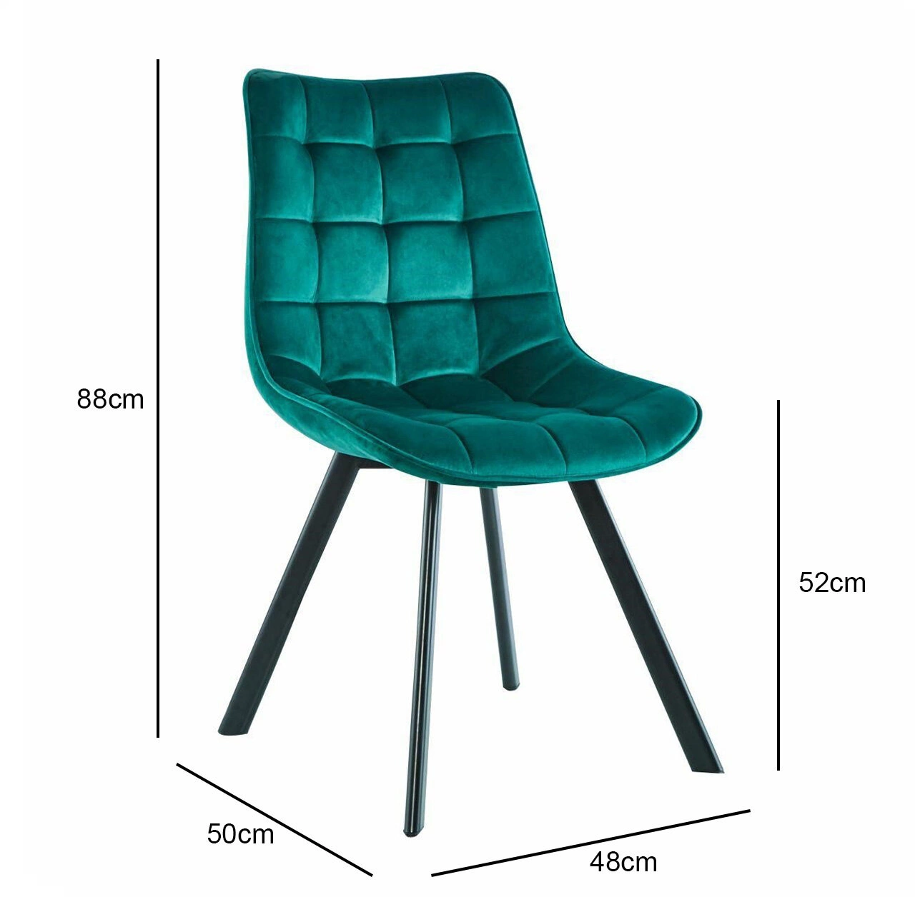 Čalouněná sametová židle Moly Intesi je dokonalou kombinací moderní elegance, pohodlí a odolnosti. Široké sedadlo o výšce 52 cm a hloubce 50 cm je potažené měkkou sametovou látkou v módní tmavě zelené barvě, která zajišťuje luxusní pocit na dotek. Stabilitu konstrukce zaručují čtyři černé kovové nohy s matnou povrchovou úpravou, které dodávají celku výrazný charakter. Model Moly byl navržen s ohledem na vybavení jídelny a obývacího pokoje, skvěle se však hodí i do kuchyně, kavárny či stylové restaurace.