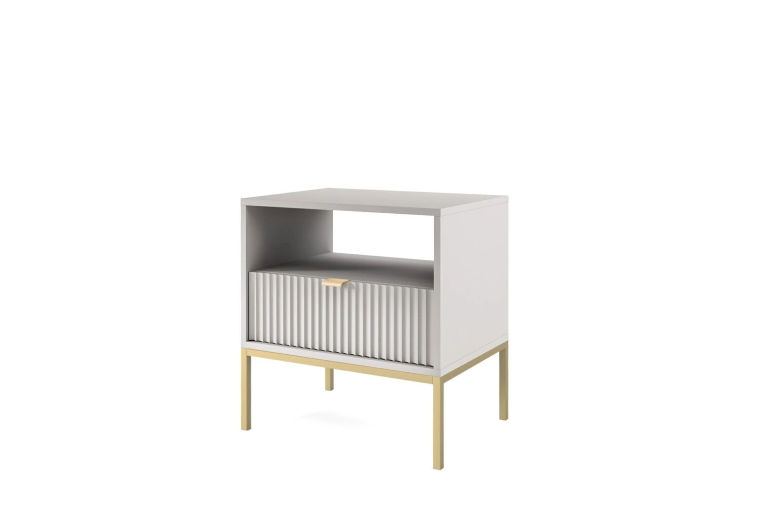 Noční stolek Delicious od značky Intesi je výjimečný kus nábytku do ložnice navržený ve stylu glamour. Zaujme rýhovaným, matným čelem v módním odstínu šedé, zlatými úchyty a štíhlými kovovými nohami. Díky šířce 54 cm a hloubce 39 cm nabízí tento noční stolek se zásuvkou a otevřenou policí nejen atraktivní vzhled, ale i praktické řešení pro každodenní použití.