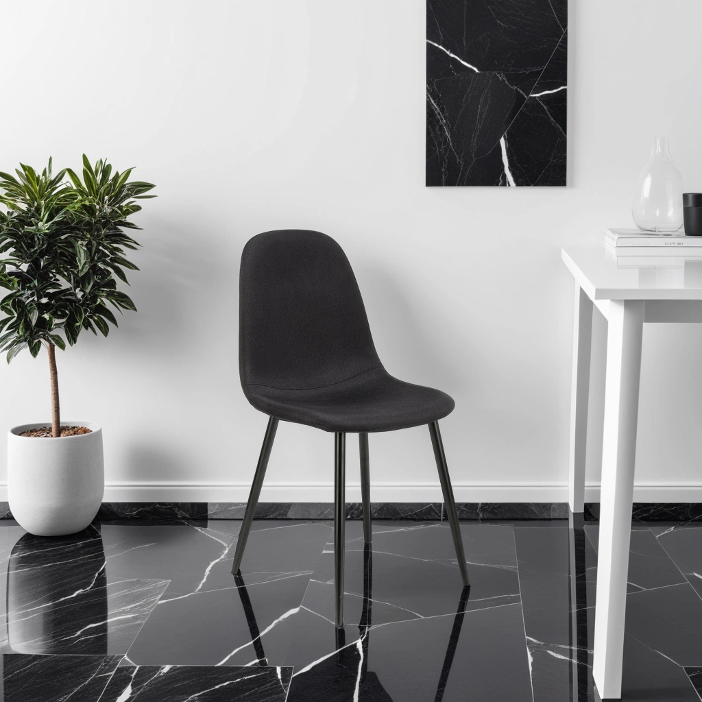 Černé čalounění je nejen elegantní, ale i praktické – materiál se snadno udržuje v čistotě, což oceníte při každodenním používání. Kovová konstrukce zajišťuje dlouhou životnost i při intenzivním používání. Díky kompaktnímu tvaru můžete židli bez obav postavit k velkému jídelnímu stolu i do menší kuchyně, aniž by zabírala zbytečně mnoho místa.